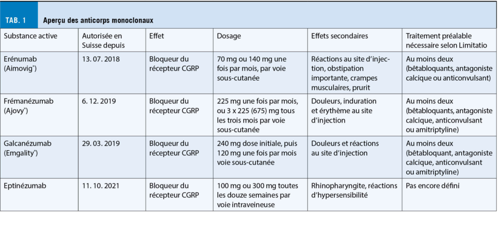 Dans la nouvelle déclaration de consensus, soutenue par la European Headache Federation et la European Academy of Neurology, les quatre anticorps monoclonaux érénumab, frémanézumab, galcanézumab et eptinézumab sont considérés comme un traitement préventif de troisième ligne (8). Le tableau 1 en donne un aperçu.