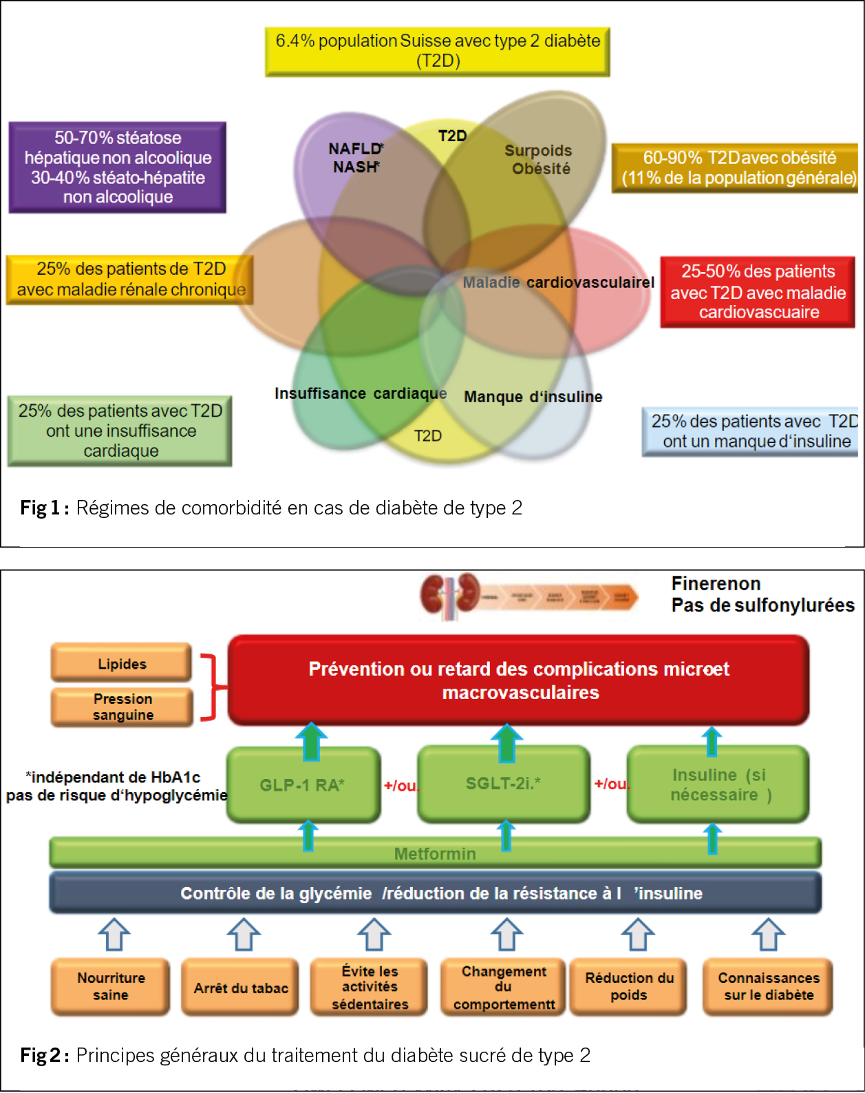 La figure 1 résume les comorbidités les plus fréquentes dans le diabète sucré de type 2 en Suisse, ainsi que leur prévalence. Toutes les comorbidités ont fait l’objet de progrès importants et de nouvelles connaissances au cours des dernières années. La seule comorbidité, très fréquente chez les diabétiques, pour laquelle il n’existe pas encore de recommandations thérapeutiques universelles et qui nécessite encore un important travail de recherche est la stéatose hépatique non alcoolique (NAFLD), également appelée aujourd’hui stéatose hépatique métabolique associée (MAFLD), car cette forme est très souvent associée à un syndrome métabolique, à l’obésité et au diabète (50-70%). Le terme non alcoolique a été remplacé par celui d’alcoolique, car une consommation légère à modérée d’alcool est tout de même assez fréquente dans ce groupe de population. Ce que l’on sait déjà, c’est que le GLP-1 RA et le GLP-1/GIP RA peuvent réduire la stéatose hépatique et la progression vers la fibrose et que les inhibiteurs du SGLT-2 ont également un effet positif, la perte de poids étant probablement le facteur le plus important.