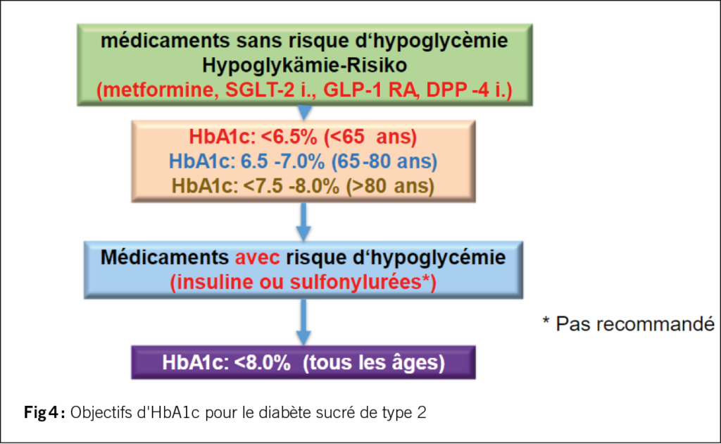 Comme il n’y a pas de risque d’hypoglycémie avec une double ou triple combinaison (metformine, inhibiteur du SGLT-2, GLP-1 RA ou inhibiteur de la DPP-4), l’objectif est HbA1c <6,5% ou aussi proche de la normale que possible pour toutes les personnes de moins de 65 ans. Si l’âge est >65 ou 80 ans, on peut être un peu plus indulgent. La figure 4 illustre ces recommandations. Ce n’est qu’en cas de traitement à l’insuline ou aux sulfonylurées, ces dernières n’étant plus recommandées, que l’on ne souhaite pas atteindre une HbA1c trop basse, en raison du risque d’hypoglycémie. L’HbA1c devrait cependant toujours être < 8,0% pour tous les groupes d’âge, même en cas de traitement à l’insuline.
