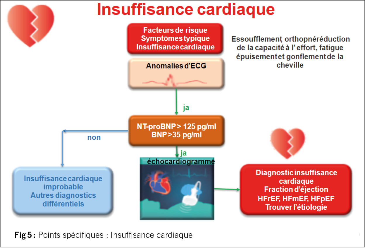 Pour le dépistage précoce de l’insuffisance cardiaque, il est recommandé d’interroger tous les patients sur les symptômes typiques (dyspnée, orthopnée, réduction de la capacité d’effort, fatigue, œdème des chevilles). Si un ou plusieurs symptômes sont présents et/ou si l’ECG présente des anomalies, le NT-proBNP ou le BNP doivent être déterminés. Si les valeurs sont élevées, les patients doivent être adressés à un cardiologue pour une échocardiographie. Cet examen permet de diagnostiquer l’insuffisance cardiaque et de la classer en HFrEF, HFmEF ou HFpEF en fonction de la fraction d’éjection systolique. La figure 5 illustre le déroulement de cet examen. Outre le traitement établi pour l’HFrEF (inhibiteurs de l’ECA/sartans, diurétiques, bêtabloquants, antagonistes de l’aldostérone), les inhibiteurs du SGLT-2 sont recommandés pour la fraction d’éjection préservée et réduite. Les inhibiteurs du SGLT-2 sont le seul groupe de médicaments présentant une réduction significative des hospitalisations pour insuffisance cardiaque à fraction d’éjection préservée (HFpEF).