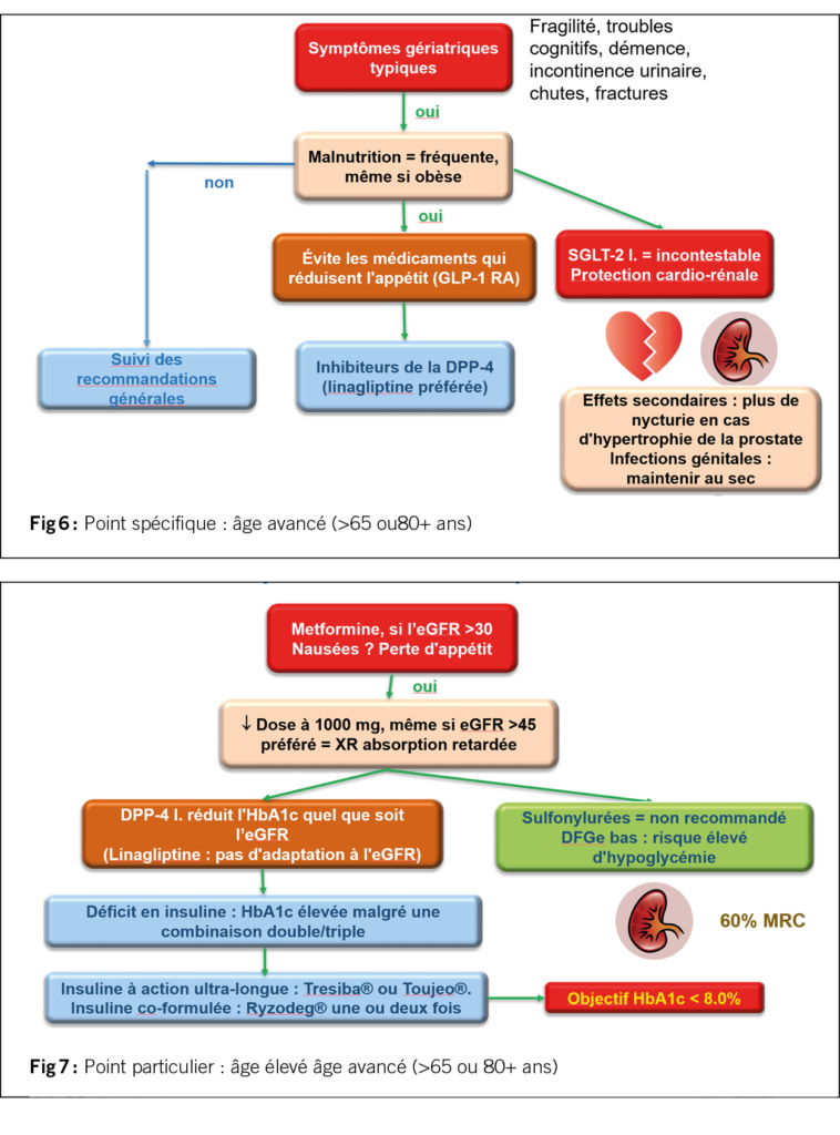 Les patients >65 ans souffrent souvent de maladies gériatriques typiques et présentent souvent une malnutrition, même s’ils sont obèses (figures 6 et 7). Chez ces patients, on souhaite éviter l’effet coupe-faim du GLP-1 RA et on préfère les inhibiteurs de la DPP-4. La linagliptine (Trajenta®) est privilégiée, car la dose ne doit pas être adaptée au eDFG. L’effet rénocardioprotecteur des inhibiteurs du SGLT-2 est également incontesté dans ce groupe.