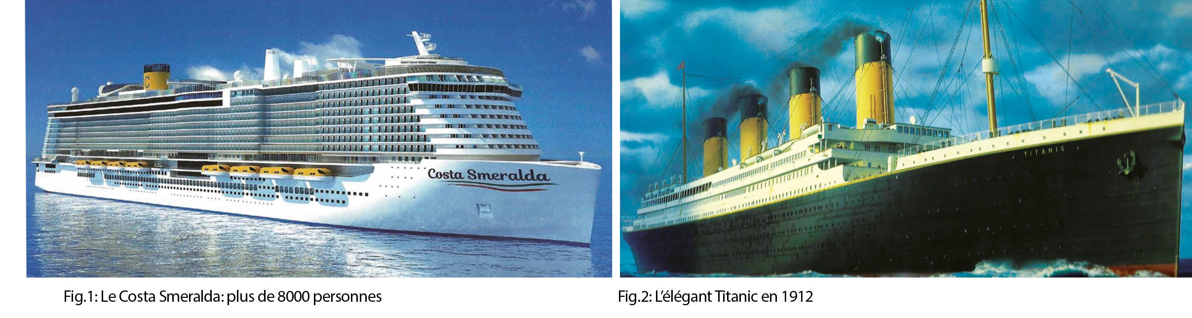 En de nombreux endroits croissent des mégapoles, souvent bordées de bidonvilles dont les habitants luttent pour la survie. Les logements manquent, les parcs de stationnement aussi. Le transport routier, ferroviaire, aérien et maritime s’ accroît de façon exponentielle, nécessitant d’ agrandir autoroutes, gares, aéroports et bateaux. Les paquebots d’ aujourd’ hui tiennent davantage d’ un immeuble locatif flottant (fig. 1) en comparaison de nos élégants vieux transatlantiques (fig. 2).