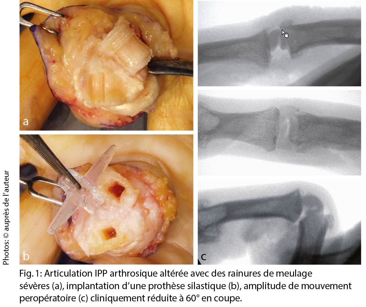 Un traitement conservateur de la douleur ayant perdu son efficacité est la principale indication de la chirurgie, ainsi que la destruction prononcée et l’ instabilité subséquente des articulations (forme souvent érosive). Les ganglions articulaires/kystes mucoïdes ne sont excisés que s’ ils sont douloureux, très gros ou perforants. Cela peut être combiné avec une synovectomie, l’ ablation des ostéophytes et la dénervation. En règle générale, l’ arthroplastie (remplacement de l’ articulation) est effectuée sur l’ articulation IPP. La plupart de l’ expérience a été acquise avec les prothèses silastiques utilisées depuis les années 1960, des charnières flexibles et monoblocs en silicone, qui sont insérées dans les cavités médullaires adjacentes sans ostéointégration (fig. 1). Elles présentent un faible taux de complications, permettent une amplitude de mouvement moyenne de 60° (fortement dépendante de l’ amplitude de mouvement préopératoire) et gardent un effet thérapeutique à 10 ans d’ environ 90 % (5, 6). Le remplacement de la prothèse est plus facile que celui des prothèses de surface (2 pièces, couple d’ usure PE métal ou pyrocarbone) car il n’ y a pas de connexion fixe à l’ os. Le seul avantage des prothèses de remplacement de surface est une plus grande stabilité (surtout latérale), c’ est pourquoi elles sont installées surtout à l’ articulation IPP de l’ index ou du majeur. Le taux de révision est légèrement plus élevé, et la mobilité et le taux de survie sont légèrement moins bons qu’ avec les prothèses silastiques (7). Si le profil de charge est élevé (travailleur manuel), on peut également envisager une arthrodèse, qui est très stable et présente un faible taux de révision (8). Au niveau de l’ articulation DIP, une arthrodèse est généralement réalisée à 0°, mais dans le cas d’ un profil de charge spécial/élevé (artisan), elle peut être réalisée en légère flexion de 10-30°. Si une mobilité est nécessaire au niveau de l’ articulation IPD (musicien, instrument à cordes), une prothèse silastique peut également être utilisée. La durabilité est similaire à celle de l’ articulation IPP, et l’ amplitude de mobilité est d’ un bon 30° (9).