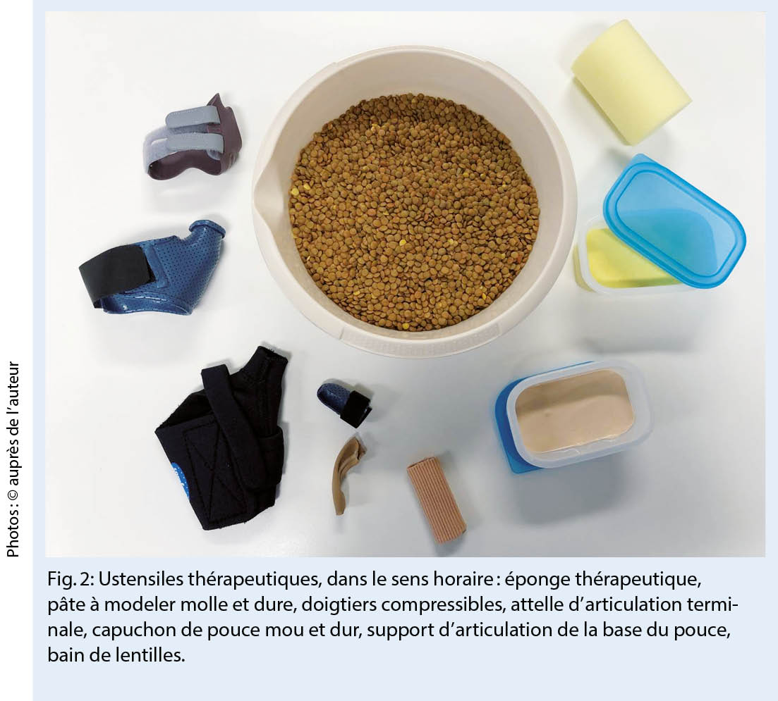Le traitement conservateur consiste à préserver les fonctions, à réduire la douleur et à fournir un suivi et une éducation à long terme au patient. La mesure la plus durable pour préserver la fonction de la main est d’ encourager le patient à utiliser ses mains régulièrement et de manière aussi diversifiée que possible, que ce soit dans la vie quotidienne ou pour les travaux manuels, mais aussi pour le sport ou le jardinage. L’ ergothérapie (conseils ergonomiques, distribution d’ aides, pose d’ attelles et d’ orthèses de stabilisation) (fig. 2) peut compenser une détérioration temporaire ou rétablir des fonctions, mais n’ est souvent pas disponible à long terme. Par conséquent, la motivation du patient à rester indépendant et actif, à maintenir un programme d’ exercices quotidiens gérables par lui-même (mobilisation et renforcement avec de la pâte à modeler/une balle en mousse plastique) est très importante et a un impact significatif sur l’ indépendance et la qualité de vie (2).