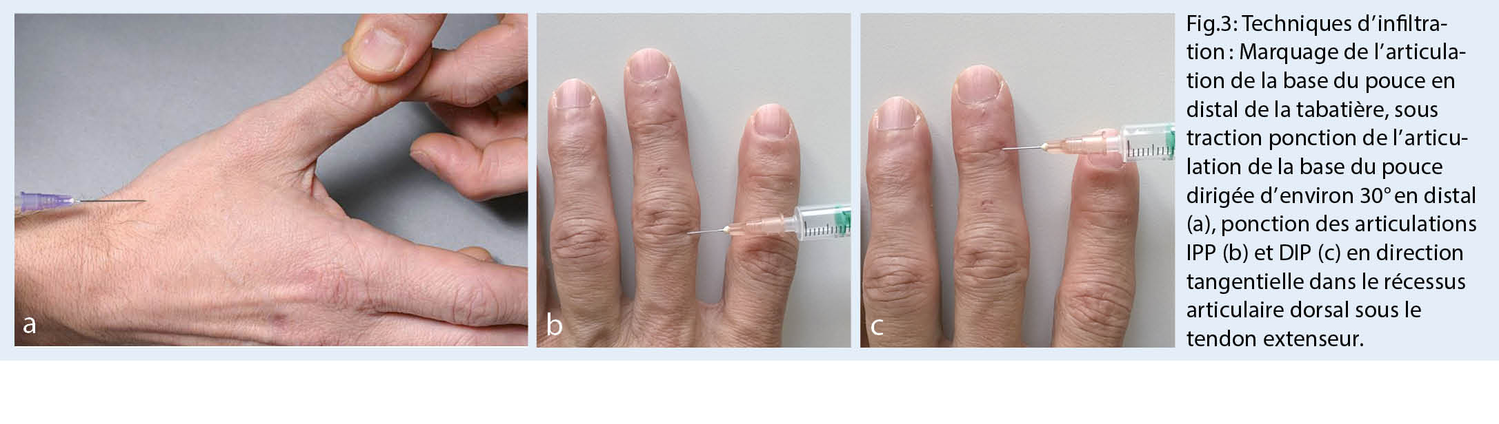 Les exacerbations de la douleur, surtout lorsqu’ elles sont associées à des douleurs de repos et de nuit, peuvent être efficacement réduites par des injections intra-articulaires d’ une préparation de cortisone retard. Bien que cet effet soit controversé dans la littérature (4), notre expérience est très bonne à cet égard. L’ infiltration d’ une articulation de la base du pouce douloureuse est efficace au bout de 2 à 3 jours et produit souvent un effet sur plusieurs mois. De nombreux patients se débrouillent à plus long terme avec 2 ou 3 infiltrations par an. Les infiltrations au niveau des articulations IPD et IPP et celles avec des préparations d’ acide hyaluronique sont un peu moins efficaces (fig. 3).