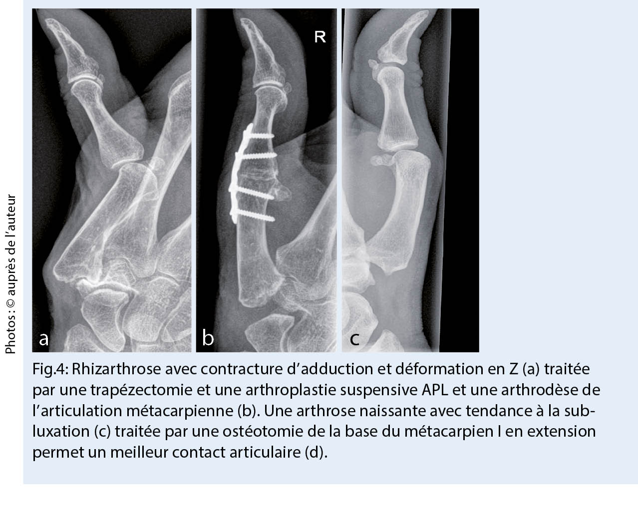 Si une rhizarthrose sévère avec subluxation et déformation en Z est présente, elle doit être stabilisée en plus par une capsulodèse ou une arthrodèse dans l’ articulation métacarpienne (fig. 3). Dans le cas d’ un profil de charge élevé (artisan, agriculteur), l’ arthrodèse robuste de l’ articulation de la base du pouce est souvent utilisée. En ce qui concerne les résultats cliniques, aucune différence significative n’ a été constatée à ce jour entre les techniques susmentionnées (10). Au stade initial de la rhizarthrose, une ostéotomie basale étendue de l’ os metacarpien I (fig. 4) peut augmenter la surface de contact de l’ articulation et ainsi obtenir une réduction de la douleur (12). La stabilisation ligamentaire (lig. intermetacarpale I-II) de l’ articulation a un effet similaire en améliorant la congruence des surfaces articulaires. Malgré de bons résultats, ces interventions ne sont pas très courantes car elles doivent être réalisées à un stade plus précoce.