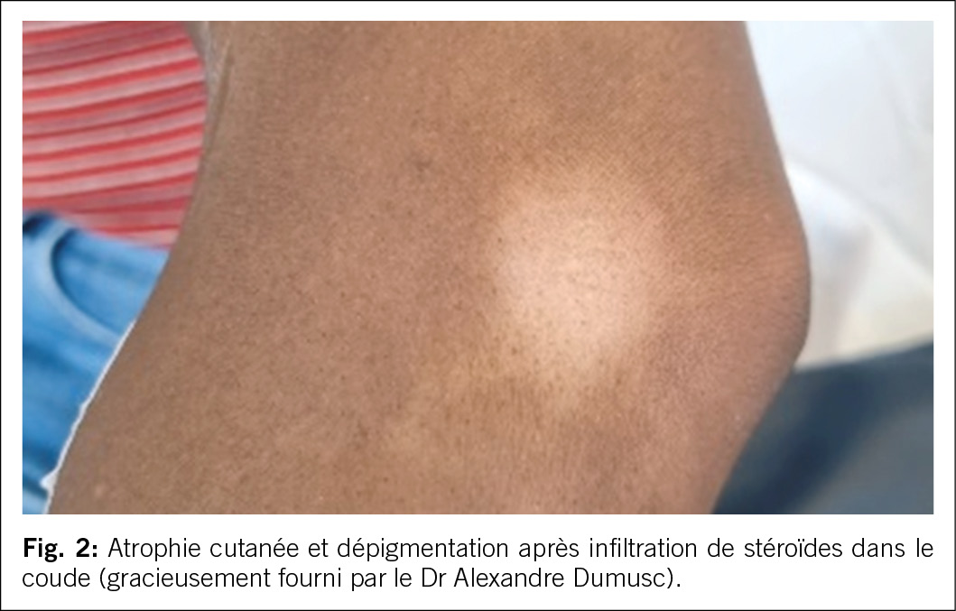 2. Effets secondaires possibles: L’ infiltration de stéroïdes dans les articulations superficielles, comme les articulations des doigts, peut entraîner des atrophies cutanées et des dépigmentations (illustration 2). Cela survient généralement 2–3 mois après l’ infiltration et se normalise d’ elle-même après jusqu’ à deux ans (5). Cela peut également survenir dans des articulations profondes comme les articulations facettaires de la colonne lombaire. Non seulement l’ administration orale, mais aussi l’ administration intra-articulaire répétée de stéroïdes à effet prolongé peut entraîner un syndrome de Cushing ou d’ autres dommages induits par les corticostéroïdes comme l’ ostéoporose, la peau de parchemin, etc. Cependant, il faut considérer que l’ alternative à l’ infiltration articulaire est souvent des anti-inflammatoires oraux, qui ont également des effets secondaires qui doivent être mis en contexte.
