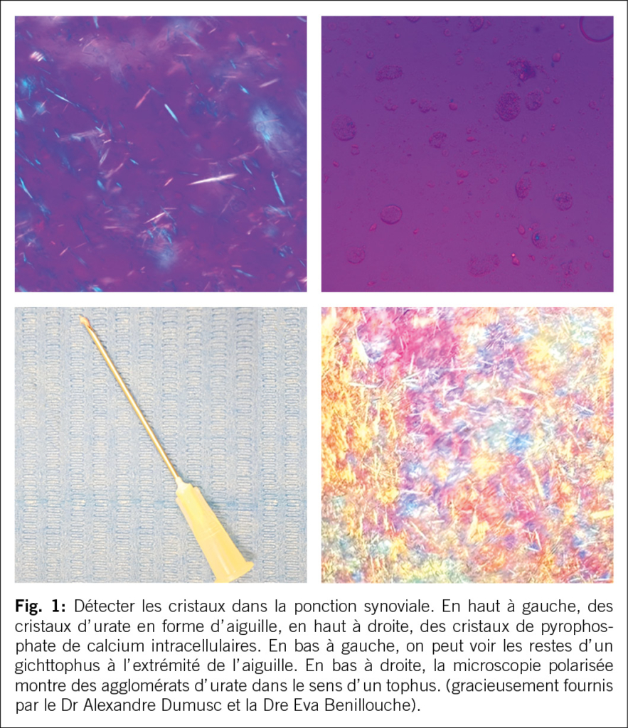 1. Utilité diagnostique: Le premier objectif est d’ exclure une arthrite septique ou bactérienne. Attention: le prélèvement de Gram a une sensibilité de seulement 50 %. Le standard d’ or est la culture. Pour certaines questions spécifiques, comme la détection de la borréliose ou de Tropheryma whipplei, une PCR est réalisée (1). La microscopie en polarisation peut détecter des cristaux fréquents dans l’ arthrite, tels que l’ urate et le pyrophosphate de calcium (illustration 1). Le nombre de cellules différencie un état inflammatoire (>2000 cellules par mm3) d’ un état non inflammatoire, comme souvent dans l’ arthrose. Une arthrose activée devrait à notre avis être diagnostiquée au moins une fois par ponction. L’ injection d’ anesthésiques locaux (souvent mélangés à des stéroïdes) peut déterminer si la cause de la douleur est réellement intra-articulaire.