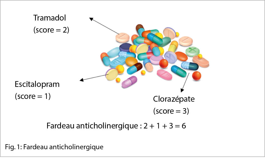 Le « fardeau anticholinergique » est défini comme l’ effet cumulatif de la prise d’ un ou de plusieurs médicaments susceptibles d’ induire des effets indésirables de l’ ACh (22). La première étape du calcul de la charge en ACh consiste à identifier tous les médicaments à activité anti-ACh, puis à additionner le score de chaque substance (fig. 1). Le score obtenu permet d’ identifier les patients présentant un risque élevé d’ effets indésirables. A noter toutefois que les échelles se basent sur une simple addition du score 1, 2 ou 3 de chaque médicament pour établir le fardeau anticholinergique global chez un patient polymédiqué sans qu’ aucun élément ne permette de déterminer si l’ effet anticholinergique cumulé peut se traduire par une simple addition des scores, comme c’ est généralement proposé.