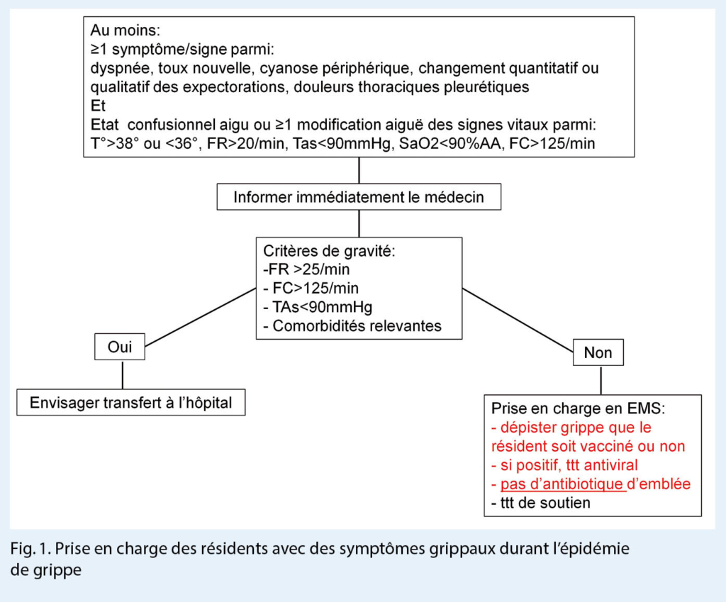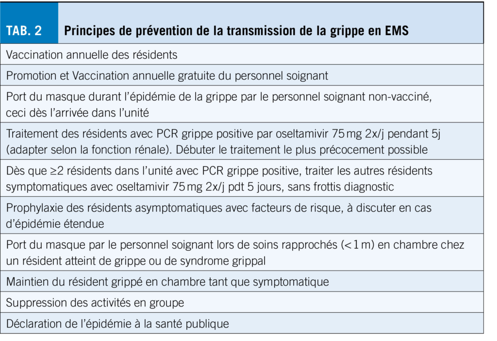 La prévention primaire de la grippe est basée sur la vaccination et le principe de l’ immunité de groupe. En effet, avec un taux de vaccination de > 80 % dans le groupe entier (résidents et personnel participant aux soins), on peut limiter le risque d’ une épidémie dans l’ institution (15). L’ immunité de groupe permet de protéger les résidents qui, en raison de l’ immunosénescence, développent moins d’ anticorps. En cas d’ épidémie de grippe, la prévention et le contrôle de l’ infection sont une tâche ardue (11). En période hivernale, lorsqu’ un résident présente des symptômes grippaux, il est recommandé d’ effectuer une recherche étiologique (PCR grippe sur un frottis naso-pharyngé) en premier lieu (Fig. 1.) En cas de grippe prouvée, la mise en place de Mesures Additionnelles Gouttelettes (port du masque) et l’ instauration d’ un traitement par oseltamivir 75 mg 2 x / j sont recommandés. Lors d’ épidémie documentée dans un EMS, tous les résidents symptomatiques devraient bénéficier d’ un traitement d’ oseltamivir 75 mg 2 x / j pendant 5 jours, sans frottis diagnostic (Tab. 2). L’ utilité du traitement d’ oseltamivir reste controversée (14, 16). Il faut cependant relever que plusieurs études suggèrent que le traitement antiviral aurait un impact sur le risque de propagation du virus dans l’ EMS et pourrait limiter les épidémies. Les données à disposition concernant l’ efficacité de la prophylaxie chez les résidents asymptomatiques sont contradictoires quant à l’ impact sur la durée de l’ épidémie (12, 16) et n’ est donc pas recommandée en l’ absence de facteurs à risque individuels, c’est-à-dire de comorbidités sévères mettant le résident à risque de complications graves. Les Mesures Additionnelles Gouttelettes (port du masque lorsqu’ un résident a une grippe avérée) doivent être respectées par tout le personnel participant aux soins, même par le personnel vacciné. Afin de limiter au maximum la propagation du virus au sein de l’ EMS, il est recommandé que les résidents symptomatiques ne participent pas aux activités de groupe, le temps des symptômes (Tab. 2).