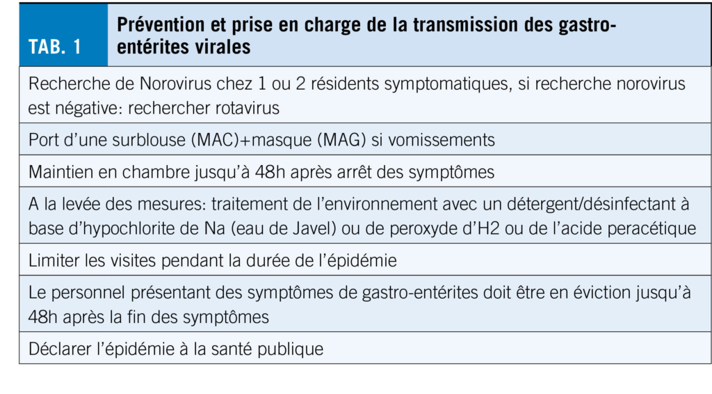 En cas de gastro-entérite, la mise en place rapide de mesures (Mesures Additionnelles Contact (surblouse), voire des Mesures Additionnelles Gouttelettes (surblouse et masque de soins) en cas de vomissements) est essentielle pour limiter la dissémination du micro-organisme (Tab. 1) (4). Il est recommandé de faire confirmer le diagnostic étiologique (recherche de virus dans les selles) (3). L’ hygiène des mains du personnel joue un rôle capital dans le contrôle de la transmission du virus et la majorité des solutions hydro-alcooliques sont efficaces contre les virus (voir les informations du fabricant). Un maintien en chambre et un arrêt des activités de groupe sont recommandés jusqu’ à 48 h après la fin des symptômes. En cas d’ épidémie d’ ampleur, l’ unité concernée doit être fermée et les visites limitées. Après la levée des mesures, l’ environnement doit être traité avec un désinfectant à base d’ hypochlorite de sodium (eau de Javel), de peroxyde d’ hydrogène ou encore d’ acide peracétique (7). Le personnel soignant symptomatique doit être placé en éviction jusqu’ à 48 h après la fin des symptômes.