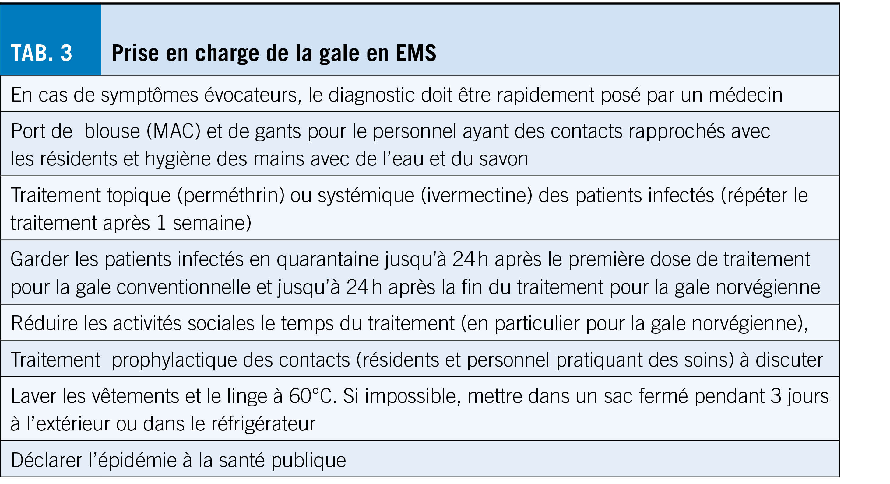 Une prise en charge précoce est primordiale pour limiter la propagation du parasite. Le traitement des personnes infectées peut être soit topique (1er choix) soit systémique (Tab. 3.) (23, 24). Des Mesures Additionnelles Contact (surblouse) et le port de gants sont recommandées lors des soins directs avec le résident pendant 24h après le début du traitement lors de gale conventionnelle, alors que ces mesures seront prolongées jusqu’ à la fin du traitement lors de gale norvégienne. Les parasites étant résistants à l’ alcool, la solution hydro-alcoolique doit être remplacée par un lavage des mains à l’ eau et au savon (25). Après la première dose de traitement et en fin de traitement, les vêtements et la literie doivent être lavés à 60°C. Le linge devant être traité à moins de 60°C est maintenu durant 3 jours à l’ extérieur dans un sac plastique hermétique ou mis au réfrigérateur pendant 24h (23, 26). Lors de gale conventionnelle, un traitement préventif (topique ou systémique) est recommandé pour les personnes ayant eu des contacts peau à peau répétitifs (entourage proche du résident, voisins de chambre et personnel participant aux soins) (27). Une poignée de mains n’ est pas considérée comme un contact prolongé peau à peau. En cas de gale norvégienne, malgré l’ absence d’ évidence dans la littérature, un traitement préventif extensif des contacts est recommandé, c’est-à-dire pour toute personne ayant eu un contact peau à peau (personnel, autres résidents) (24). Pour les contacts (personnel participant aux soins et résidents), la mise en place de traitement est de la responsabilité de la direction médicale et des soins de l’ établissement.
