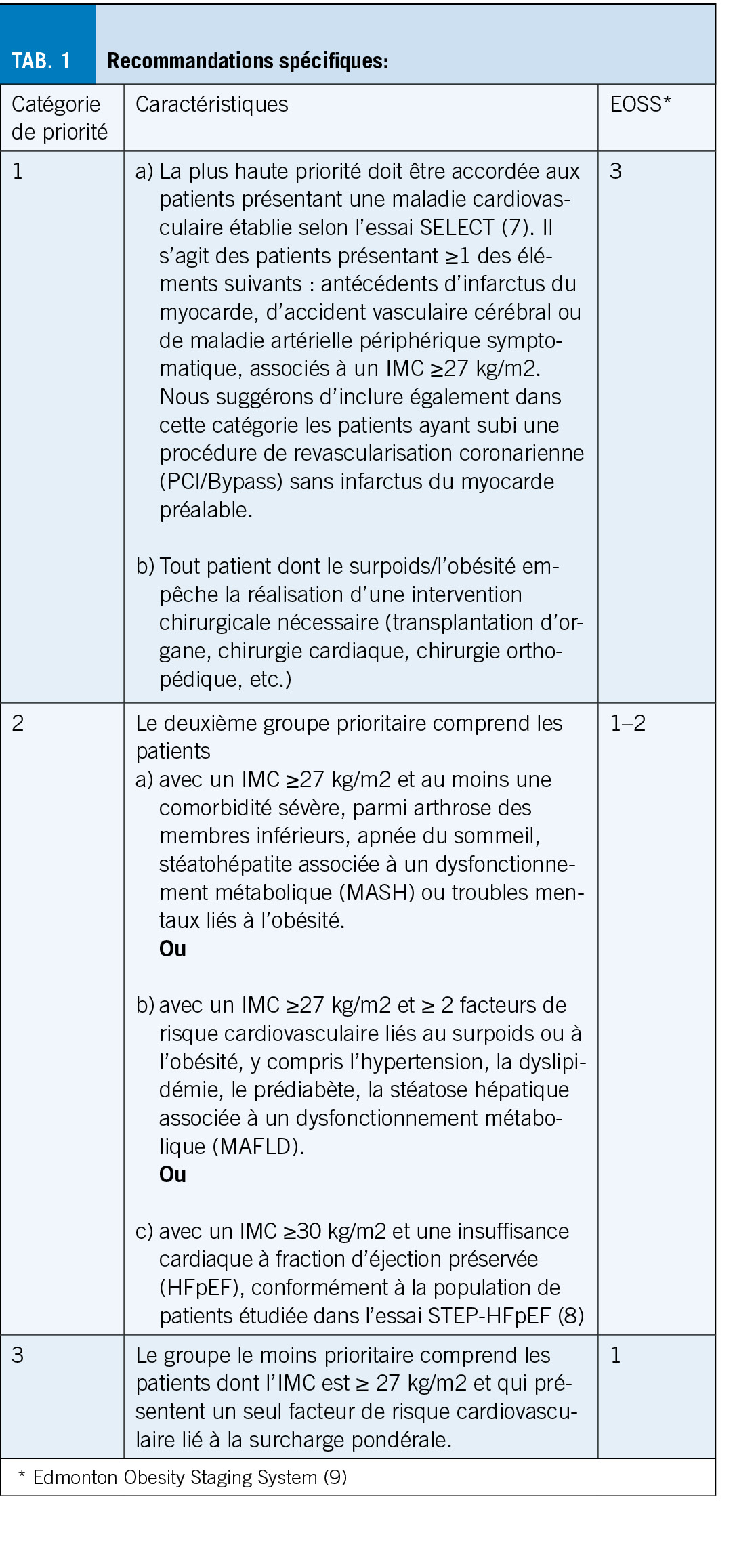 6. L’ indication du médicament Wegovy® pour la gestion du poids corporel devrait être conforme à l’ indication approuvée par Swissmedic, qui inclut les patients ayant un IMC ≥27 kg/m2 et souffrant d’ au moins une maladie liée à la surcharge pondérale. Cependant, la disponibilité limitée de 2.4 mg de semaglutide (Wegovy®) nécessite une priorisation de l’ accès au traitement. Par conséquent, nous recommandons ici trois niveaux différents de catégories de priorité.