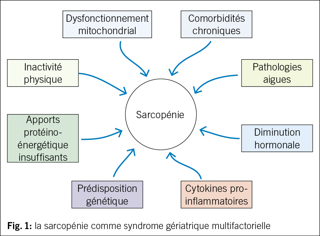 Le vieillissement est physiologiquement associé à une diminution de la masse musculaire, qui est estimé du 8 % tous les 10 ans après les 40 ans et du 15 % tous les 10 ans après les 70 ans (24). Comme déjà mentionné, des maladies systémiques sévères comme les cancers ou les insuffisances sévères d’ organe peuvent contribuer à l’ installation de la sarcopénie. Dans ce contexte la sarcopénie est définie comme secondaire et constitue une composante du syndrome anorexie-cachexie, typique des maladies en phase terminale, qui favorisent le catabolisme cellulaire et par conséquence une perte pondérale ainsi que de masse maigre (25). Cependant, dans la plupart des cas, l’ identification d’ une étiologie claire à la base de la sarcopénie est impossible, car sa pathogenèse est très complexe et implique la concurrence de plusieurs facteurs intrinsèques et extrinsèques (Fig. 1). Les facteurs intrinsèques plus importants sont la diminution des hormones anabolisants comme le testostérone, les œstrogènes, l’ IGF1 (26, 27), l’ augmentation de l’ activité de cytokines pro-inflammatoires (28) et le dysfonctionnement mitochondrial, qui provoque l’ apoptose de fibre musculaire à la suite d’ un stress oxydatif à cause de l’ accumulation des radicaux libres (29). Des évidences suggèrent également qu’ il existe une prédisposition génétique à la sarcopénie (30). Parmi les facteurs extrinsèques, l’ inactivité physique et la dénutrition protéino-énergétique jouent un rôle central dans le développement de la sarcopénie (31, 32). La sarcopénie est d’ habitude une condition chronique. Toutefois, après une hospitalisation ou un alitement de quelques jours, la synthèse de protéines musculaires est diminué du 30 % chez les personnes âgées, avec une perte d’ un kg de masse musculaire en trois jours: chaque événement aigu peut donc précipiter la situation et amener au développement d’ une sarcopénie avérée dans les individus à risque (33).
