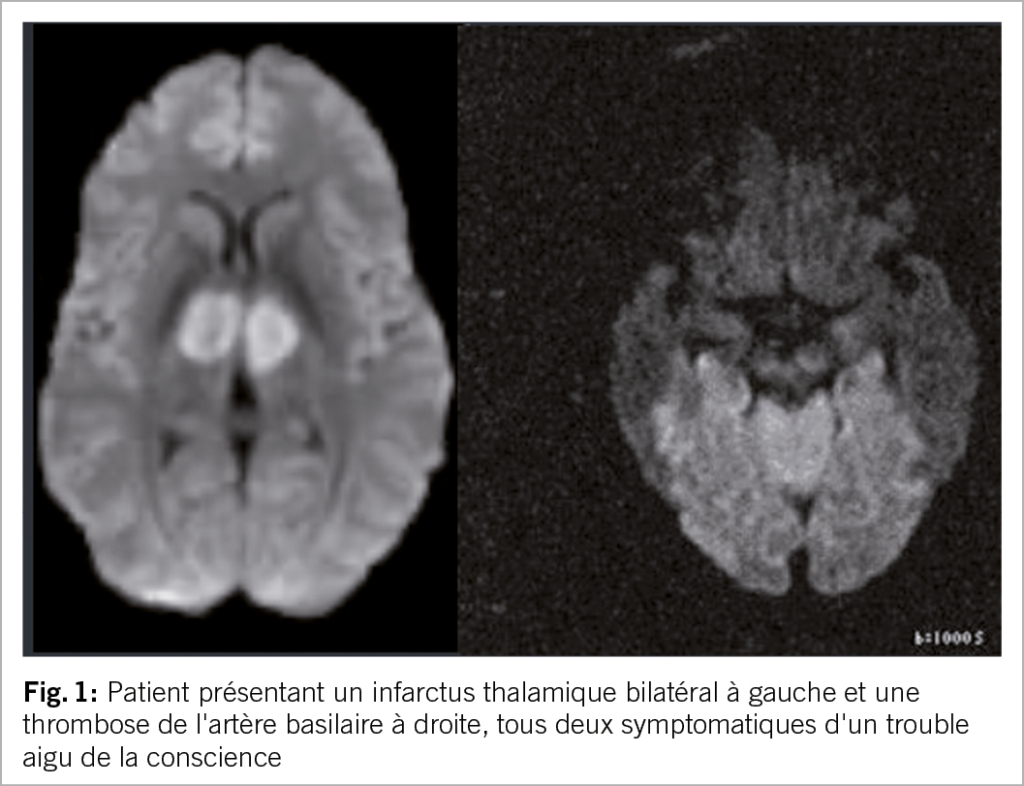 Le syndrome « top of the basilar » est causé par une occlusion de la partie distale de l’ artère basilaire ; les patients peuvent se présenter avec une perte de conscience et une tétraplégie (11). Les modifications pupillaires et les signes oculomoteurs fournissent des indices, mais un scanner ou une angiographie par résonance magnétique sont généralement nécessaires pour confirmer le diagnostic (11). Des troubles de la conscience peuvent également survenir en cas d’ infarctus thalamique bilatéral, généralement en association avec une paralysie du regard vertical (12). Les situations insidieuses sont celles où le patient est victime d’ un AVC peropératoire touchant la circulation postérieure et présente des troubles de la conscience persistants post-opératoires, attribués à l’ anesthésie (fig. 1).