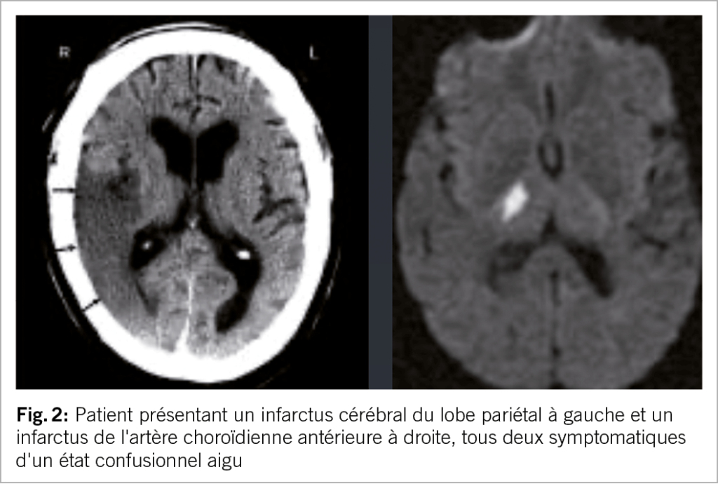 Les AVC peuvent s’accompagner de confusion, d’ excitation ou d’ agitation et être pris à tort pour un délire. Les infarctus du lobe pariétal ou ceux au niveau du territoire de l’artère choroïdienne antérieure sont typiques et peuvent provoquer une confusion aiguë. Un indice clinique utile est l’ apparition soudaine de la confusion (phase très aiguë) chez un patient auparavant asymptomatique (fig. 2).