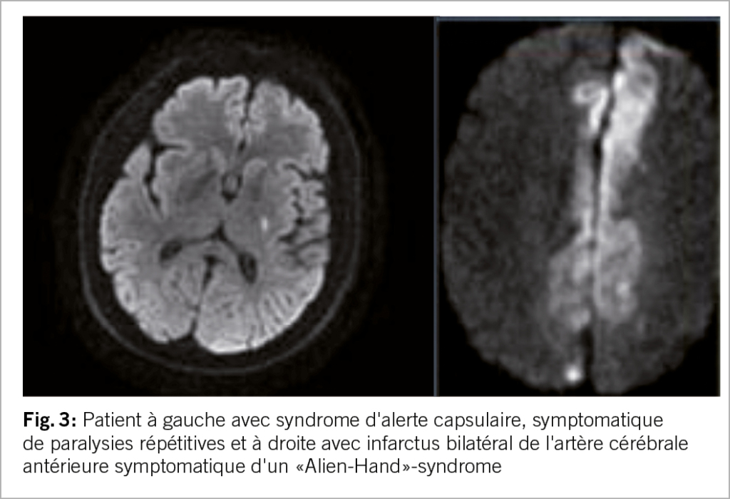 Ces mouvements peuvent être des secousses rythmiques en forme de crise, parfois accompagnées de contractions musculaires toniques prolongées. Les AIT (accidents ischémiques transitoires) de type limb shaking se manifestent par des mouvements rythmiques, involontaires et saccadés des membres dus à une sténose sévère de l’ artère carotide interne. Ces AIT hémodynamiques peuvent être déclenchées par une diminution du débit sanguin cérébral, par exemple lors d’un changement de position ou d’un effort physique, et peuvent être confondues avec des crises d’épilepsie focales. Le syndrome de la main étrangère est défini comme un mouvement involontaire et incontrôlable, mais apparemment ciblé, d’un membre supérieur. En cas d’ infarctus dans la région du corps calleux, différents comportements moteurs anormaux et involontaires peuvent se produire (12) (fig. 3).