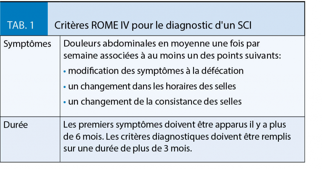 Les nouveaux critères de la classification ROME IV ont entraîné un changement de paradigme. Les maladies gastro-intestinales associées à l’absence de causes somatiques décelables sont maintenant appelées troubles de l’interaction entre le système nerveux central et le tractus gastro-intestinal. Cette appellation et basée sur les résultats de recherches actuelles qui montrent une interaction complexe des processus pathophysiologiques au cours du développement des symptômes (7). Les critères actuels de ROME IV pour le diagnostic fondé sur les symptômes du SCI sont présentés au tableau 1.