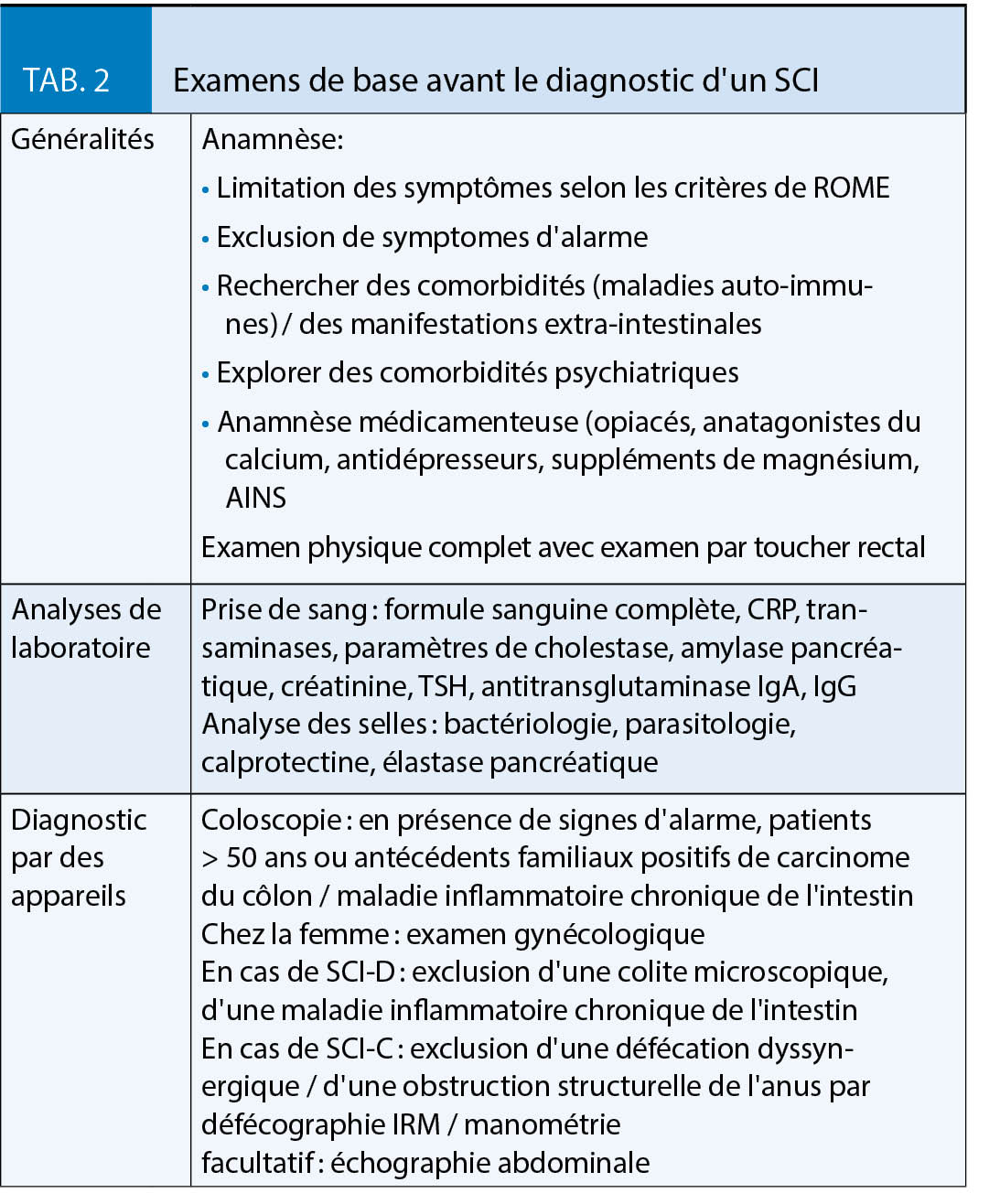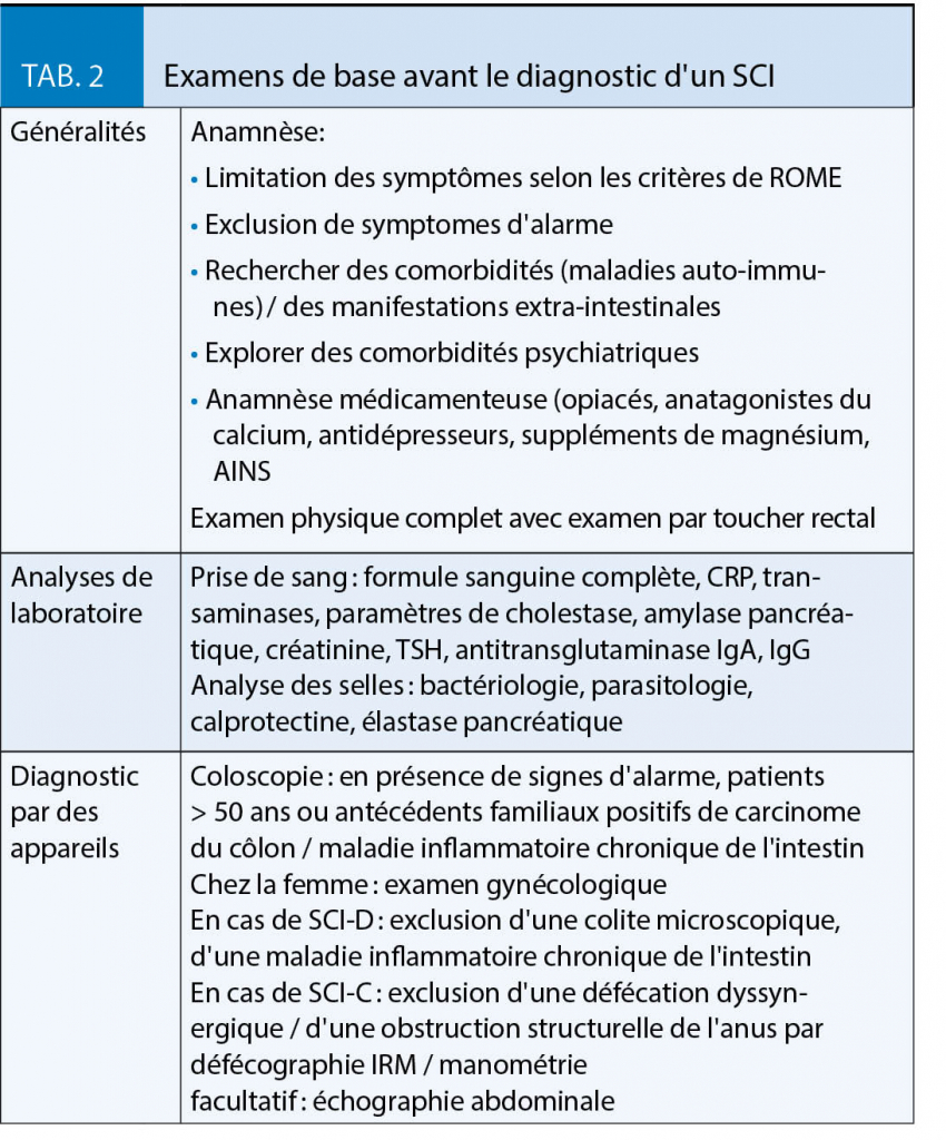 La première année au cours de laquelle les symptômes du SCI se manifestent est cruciale : l’ exclusion de maladies systémiques pertinentes est importante à ce moment là, car l’ incidence du cancer du côlon, des MICI ou de la colite microscopique augmente dès la première apparition de symptômes du SCI (11, 18) (tab. 2).