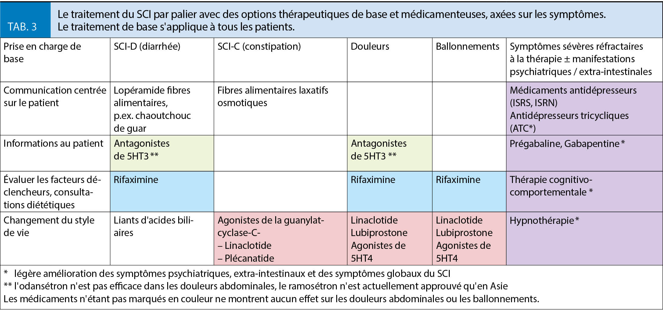 Dans le cas de troubles persistants et plus graves, il est recommandé d’ adopter une stratégie de traitement qui soit adaptée au symptôme principal du SCI et éventuellement à tout trouble extra-intestinal existant, y compris les stratégies de traitement psychopharmacologique et interdisciplinaire (tab. 3). Dans la littérature, le succès thérapeutique général de la pharmacothérapie du SCI est estimé entre 8 et 22 % par rapport au placebo (35).