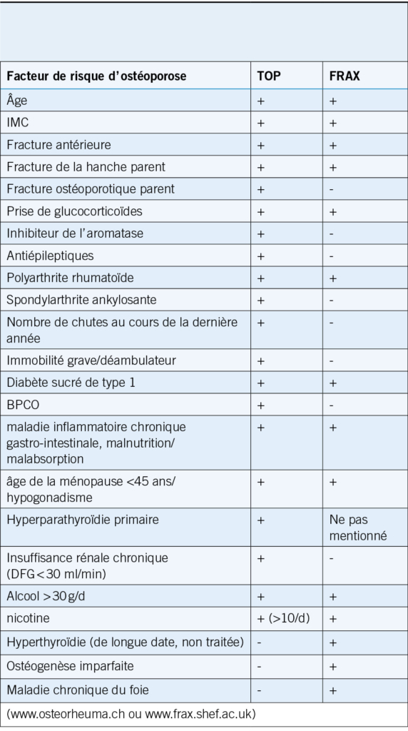 L’ indication d’ un traitement contre l’ ostéoporose est aujourd’ hui posée sur la base d’ une estimation du risque de fracture. L’ estimation se fait par l’ introduction dans un calculateur (p. ex. FRAX de l’ OMS ou «Osteoporose-Plattform», TOP), des facteurs de risque à interroger (tab. 1) et du T-score le plus bas au niveau de la colonne vertébrale, de l’ ensemble de la hanche ou du col du fémur après la mesure DXA.