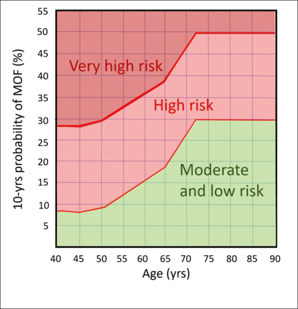 Ce qui importe en premier lieu pour l’ indication au traitement est le risque estimé d’ une fracture ostéoporotique majeure (en anglais «major osteoporotic fracture» (MOF), c.-à-d. fracture vertébrale, de la hanche, de l’ humérus proximal ou du radius distal. Un seuil d’ intervention adapté à l’ âge, tel qu’ il a été défini par l’ Association suisse contre l’  ostéoporose (ASCO) (fig. 1), est controversé par rapport à un seuil d’ intervention fixe (p. ex. risque à 10 ans de 20–25 %). Pour la prophylaxie en cas de traitement systémique par glucocorticoïdes ou hormono-ablatif, il convient de suivre des recommandations spécifiques qui, pour des raisons de taille, ne sont pas traitées dans cet article.