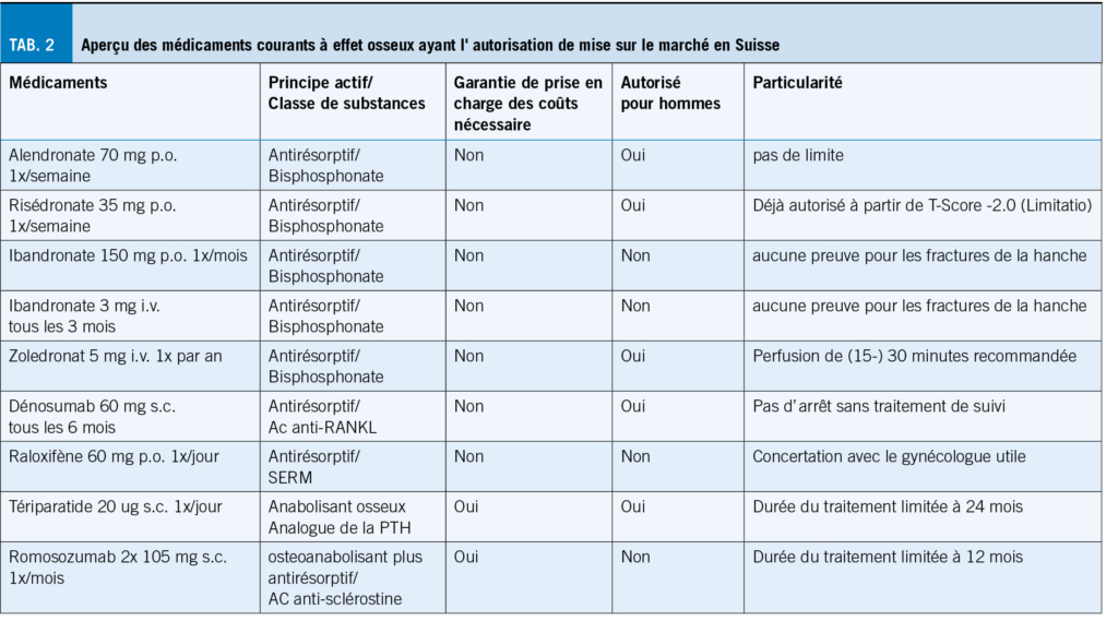Les bisphosphonates ont un effet antirésorptif par inhibition des ostéoclastes et sont utilisés depuis environ 30 ans dans le traitement de l’ ostéoporose. Les préparations courantes sont présentées dans le tableau 2. En raison de leur mode d’ action par fixation à la surface de l’ os, l’ effet antirésorptif persiste même après l’ arrêt/la fin du traitement, ce qui distingue les bisphosphonates de tous les autres médicaments contre l’ ostéoporose. Cet effet nommé «Tail Effect» est le plus prononcé avec le zolédronate. Des effets secondaires rares sont des ostéonécroses de la mâchoire et des fractures atypiques du fémur (= sous-trochantériennes), le risque augmentant avec la durée du traitement. En conséquence, après 3 à 5 ans de traitement par bisphosphonates une pause doit être considérée, d’ autant plus que la densité osseuse n’ augmente normalement pas davantage après cette période de traitement, malgré la poursuite de celui-ci (7). Les bisphosphonates sont contre-indiqués en cas de grossesse/d’ allaitement et d’ insuffisance rénale (DFG<35 ml/min). Le dénosumab (Prolia®) est un anticorps monoclonal entièrement humain contre le ligand RANK et agit via l’ inhibition des ostéoclastes. Contrairement aux bisphosphonates la thérapie ne montre pas de plateau de l’ augmentation de la densité osseuse après 10 ans d’ utilisation (8). Toutefois, après l’ arrêt ou suite à un retard dans l’ utilisation, une résorption osseuse excessive se produit immédiatement («effet rebond»), qui s’accompagne d’ un risque accru de survenue de multiples fractures vertébrales (9). Le dénosumab convient donc en premier lieu pour un traitement à long terme et ne doit en aucun cas être interrompu ou être administré avec du retard sans traitement de suivi. Les données disponibles pour l’ utilisation sûre à long terme du dénosumab se limitant à 10 ans (8), l’ indication doit être posée avec réserve chez les personnes plus jeunes. Si l’ arrêt du dénosumab s’ avérait nécessaire, le zolédronate, en particulier, s’ est avéré efficace comme traitement de suivi en raison de sa puissance antirésorptive. Cela permet de réduire le rebond, mais pas de l’ empêcher complètement. En ce qui concerne la mise en œuvre optimale de la thérapie de suivi les données disponibles sont encore insuffisantes. Tant pour les bisphosphonates que pour le denosumab, avant l’ initiation du traitement, une hypocalcémie ainsi qu’une carence importante en vitamine D doivent être exclues. En outre, pour réduire le risque d’ ostéonécrose de la mâchoire, il faut veiller à une bonne hygiène dentaire; les interventions chirurgicales sur l’ os de la mâchoire (extraction de dent, implant) doivent être évitées autant que possible sous traitement établi.