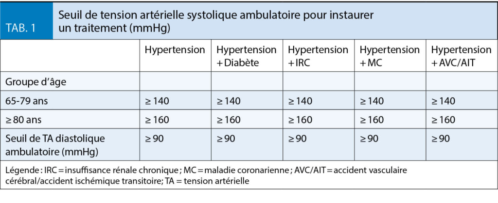 En raison du risque associé à l’ hypotension orthostatique, cette complication doit être recherchée, en particulier chez le patient sous traitement antihypertenseur présentant des symptômes compatibles avec des épisodes hypotensifs non-reproductibles durant la consultation. Il est à noter que les diurétiques de l’ anse et les alpha-bloqueurs devraient être évités, sauf en cas d’ indication autre, en raison de leur association avec les chutes (4). Finalement, la fonction rénale doit être évaluée fréquemment à la recherche d’ une péjoration de la fonction rénale pouvant être induite par une diminution de la perfusion rénale. Si toléré, la TA doit être abaissée à des valeurs systoliques de 130-139 mmHg et diastoliques de < 80 mmHg. Une valeur systolique de < 130 mmHg doit être évitée (1).