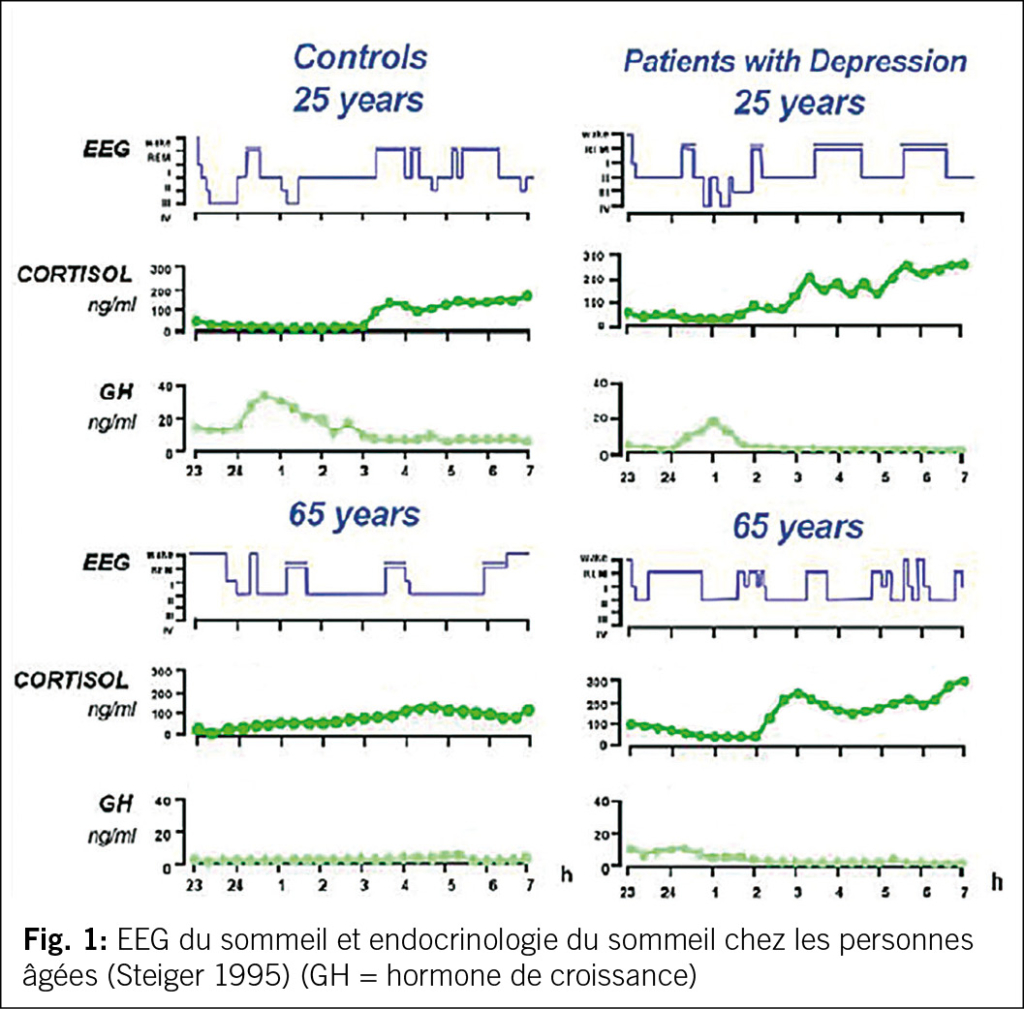 D’ après les connaissances des dernières décennies, il importe de viser avec le traitement un sommeil sain, naturel, avec des phases suffisantes de sommeil profond et de phases de sommeil non paroxysmale (sommeil REM) stables. De manière physiologique, chez la personne âgée, le sommeil se raccourcit et devient globalement plus léger. De plus, le processus C de la régulation du sommeil (composante circadiane) subit des changements, en particulier avec une montée plus précoce de la cortisole dans la deuxième partie de la nuit (réf 4, 5, 7, cf. aussi fig. 1).