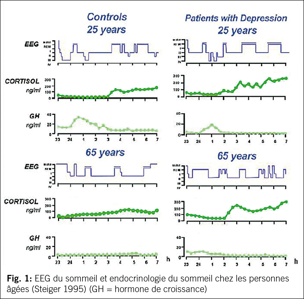 Les enregistrements EEG effectués pendant le sommeil nous donnent une indication de l’ activité électrophysiologique pendant la nuit. L’ analyse de ces enregistrements montre une alternance de sommeil non paradoxal et de sommeil paradoxal (cycle de sommeil) avec un sommeil non paradoxal profond en début de nuit et un sommeil non paradoxal léger en fin de nuit (dans les cycles de sommeil ultérieurs). Ces phases de sommeil sont également associées à une libération régulière de différentes hormones, qui présentent chacune un schéma caractéristique (4, 5, cf. fig. 1).