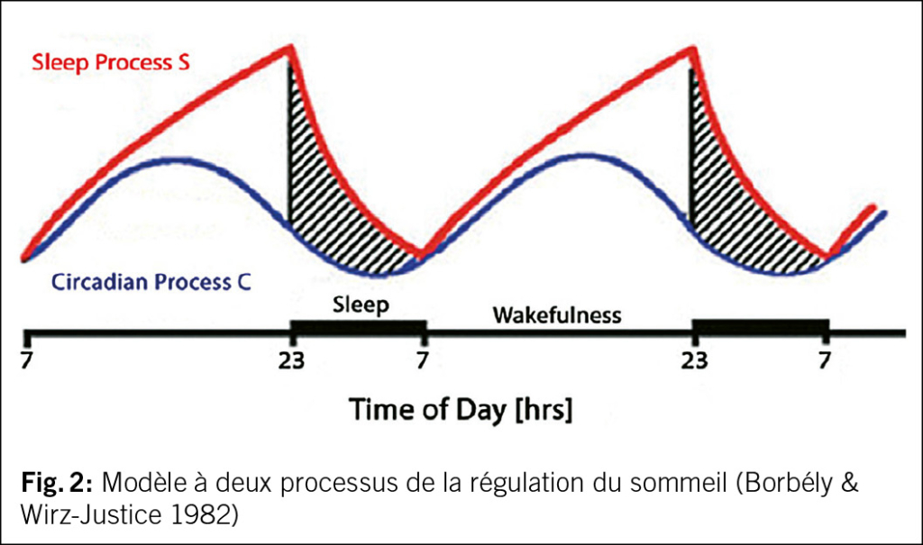 Le modèle à deux processus (6) fournit une explication pour la régulation du sommeil. Le sommeil est lié au rythme clair-obscur de la journée de 24 heures imposé par le soleil et est donc soumis à un rythme circadien. Celui-ci est contrôlé par un pacemaker endogène dans le diencéphale (nucleus suprachiasmaticus) (= processus C – circadian). Parallèlement, indépendamment du rythme lumière/obscurité du soleil, la durée de l’ éveil précédent influence notre sommeil en augmentant la pression de sommeil (processus S – pression de sommeil), (cf. fig. 2). Plus on reste éveillé longtemps, plus le sommeil de la nuit suivante est profond (processus de pression de sommeil S). On attribue au sommeil profond non REM une fonction de récupération physique et psychique ainsi qu’ une fonction de stimulation de la mémoire, notamment en raison de la réduction de l’ activité neuronale corticale et de la modification de l’ activité de certaines hormones et du système immunitaire. Le sommeil paradoxal est moins influencé par la variation de la durée d’ éveil précédente, mais plutôt lié au rythme circadien (5).