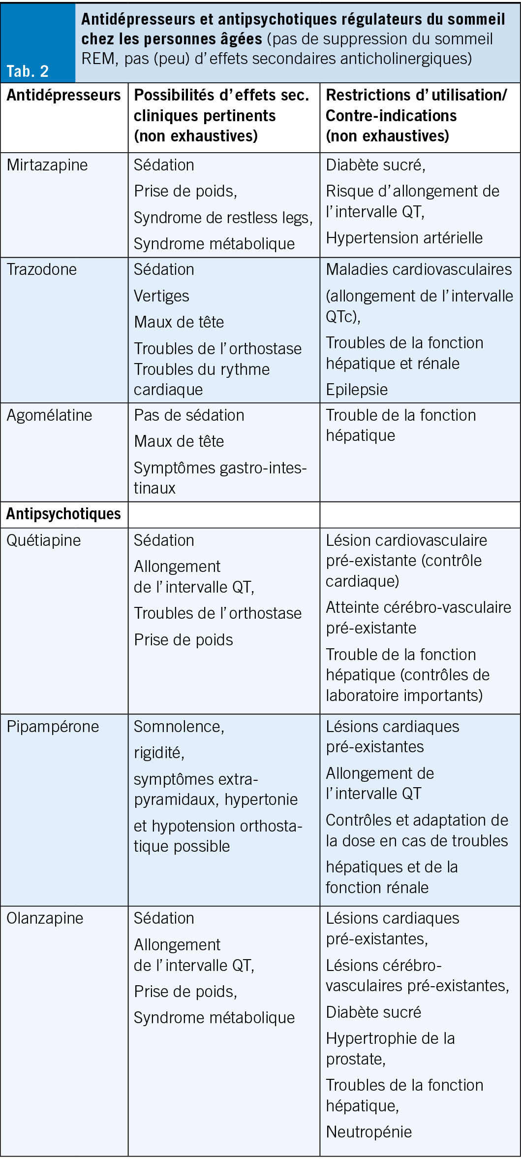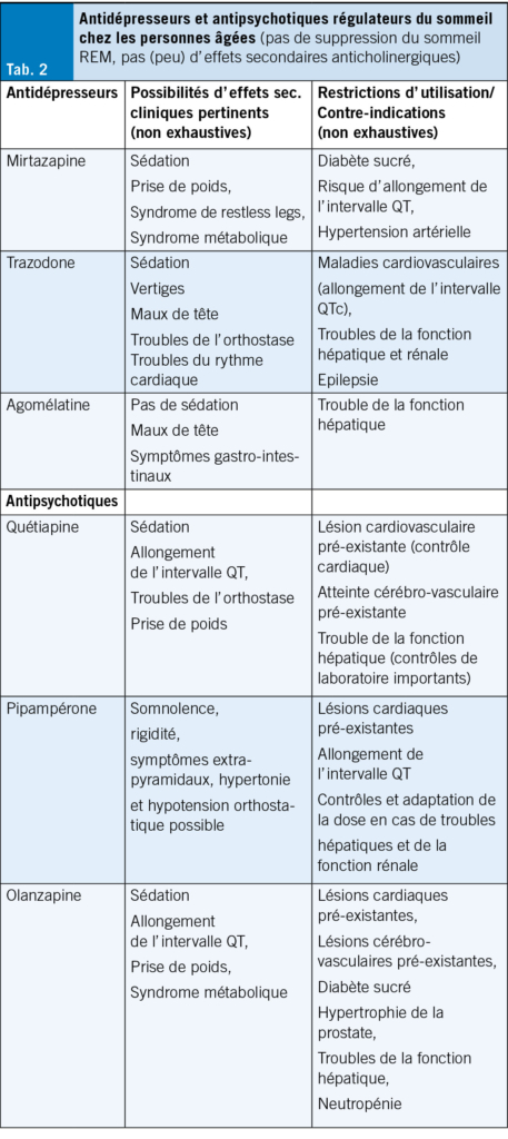 Après clarification du profil d’ effets secondaires et d’ éventuelles co-morbidités, il convient d’ utiliser chez les personnes âgées avant tout des substances qui n’ induisent pas de grandes modifications de l’ architecture du sommeil et qui provoquent de préférence une augmentation du sommeil profond sans suppression du sommeil REM (comme p. ex. la trazodone, l’ agomélatine, la mirtazapine ou, dans la classe des antipsychotiques, surtout la quétiapine et le pipampérone) (cf. tab. 2). L’ utilisation de ces substances s’ oriente – comme mentionné ci-dessus au profil des effets secondaires et se voit limitée par la présence d’ éventuelles co-morbidités (5).