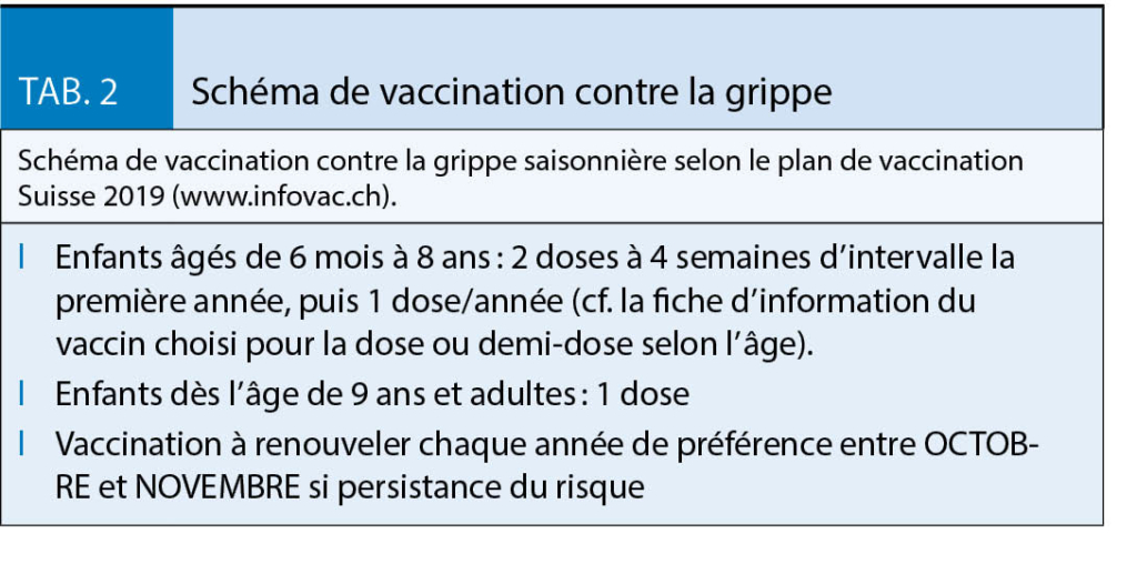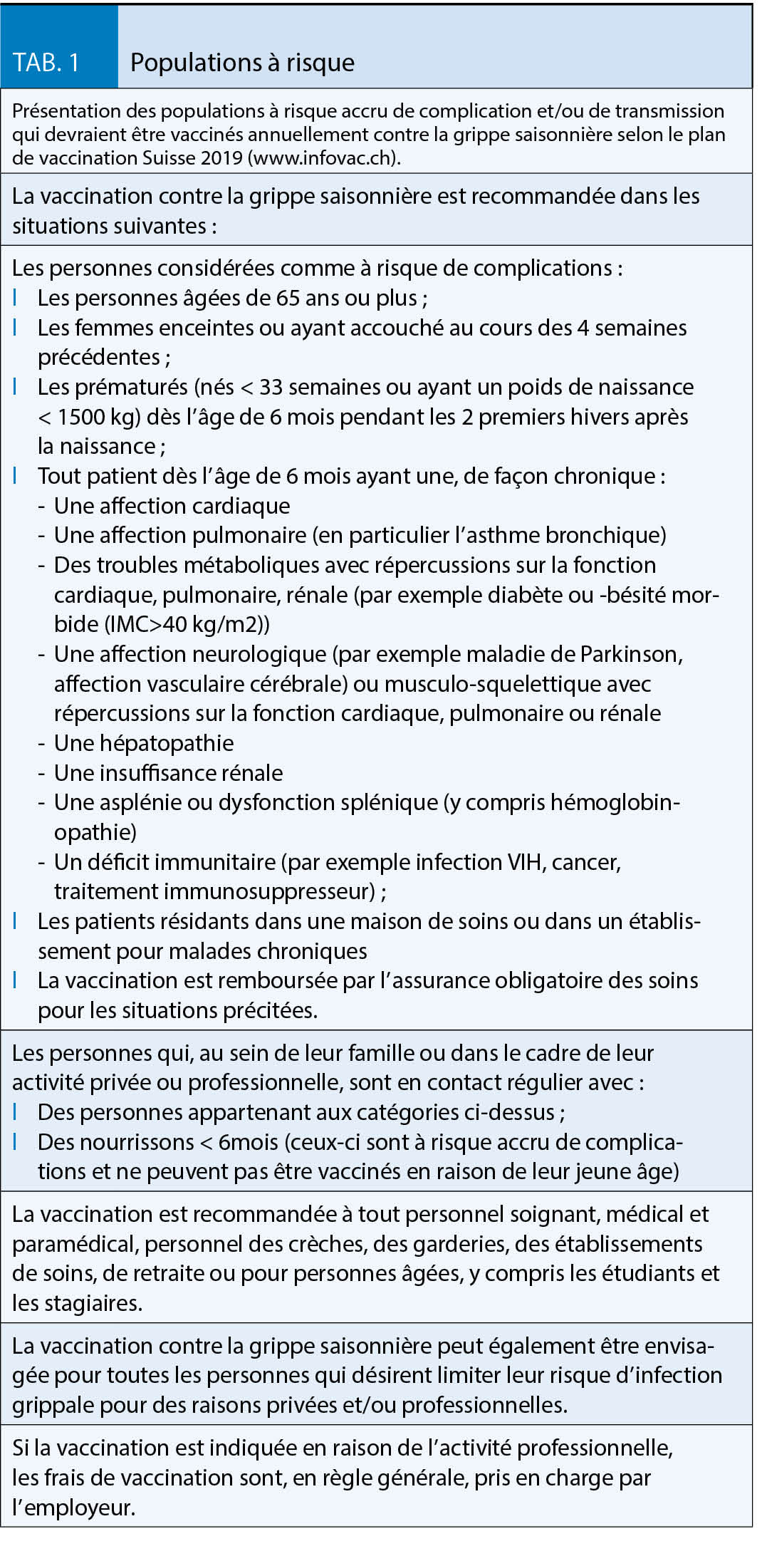 Les vaccins actuellement disponibles et autorisés pour les adultes – Ils contiennent par dose de 0,5 ml, 15 µg d’ hémagglutinine (HA) de chacune des souches virales constitutives. Il existe des vaccins trivalent (3 souches grippales = A/H1N1pdm2009, A/H3N2, et B-Victoria – Agrippal®, Fluarix®, Influvac® et Mutagrip®) et un vaccin quadrivalent (4 souches virales = trivalent + B-Yamagata – Fluarix Tetra®). Chez l’ adulte, il n’ y a pas d’ arguments cliniques à privilégier un vaccin trivalent ou un vaccin tétravalent. Le vaccin trivalent Fluad® a la particularité de contenir un adjuvant (MF59C) qui en renforce l’ immunogénicité et l’ efficacité (19). Il est particulièrement recommandé pour les adultes à partir de 65 ans (www.sevaccinercontrelagrippe.ch) (20). Si les vaccins sont disponibles pour tous, la priorité est la vaccination des personnes appartement à un groupe à risque accru de complications (Tableau 1) (www.infovac.ch). Tous les vaccins autorisés en Suisse sont inactivés et exempts de mercure et d’ aluminium. En mars dernier, l’ Organisation mondiale de la santé (OMS) a publié ses recommandations pour la composition des vaccins Influenza pour l’ hémisphère nord pour la saison 2019/2020. En comparaison avec les vaccins 2018/2019, la composition du vaccin trivalent a été modifiée en ce qui concerne les A/H3N2 (A/Kansas/14/2017) et A/H1N1 (A/Brisbane/02/2018) afin de mieux couvrir les virus en circulation. La souche B-Victoria (B/Colorado/06/2017) reste inchangée tout comme la souche supplémentaire influenzae B contenue dans le vaccin tétravalent (B / Phuket/3073/2013-like). Sans adjuvant, les vaccins sont disponibles depuis la fin du mois de septembre.