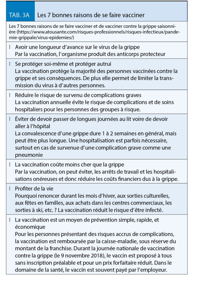La vaccination contribue fortement à diminuer le risque de transmission chez les personnes vaccinés, mais aussi chez les non vaccinés lorsque le taux de couverture vaccinale est suffisant (≥ 75% de la population) par le biais de l’ immunité de groupe (8). Les professionnels de la santé sont parmi les personnes les plus fortement exposées au risque de contracter la grippe (9). De plus, les arrêts de travail pour maladie qui en résultent impliquent souvent une charge de travail supplémentaire pour les collègues en période épidémique et/ou des contraintes de réorganisation en rapport avec le recours à du personnel intérimaire notamment dans les EMS et les hôpitaux (10).