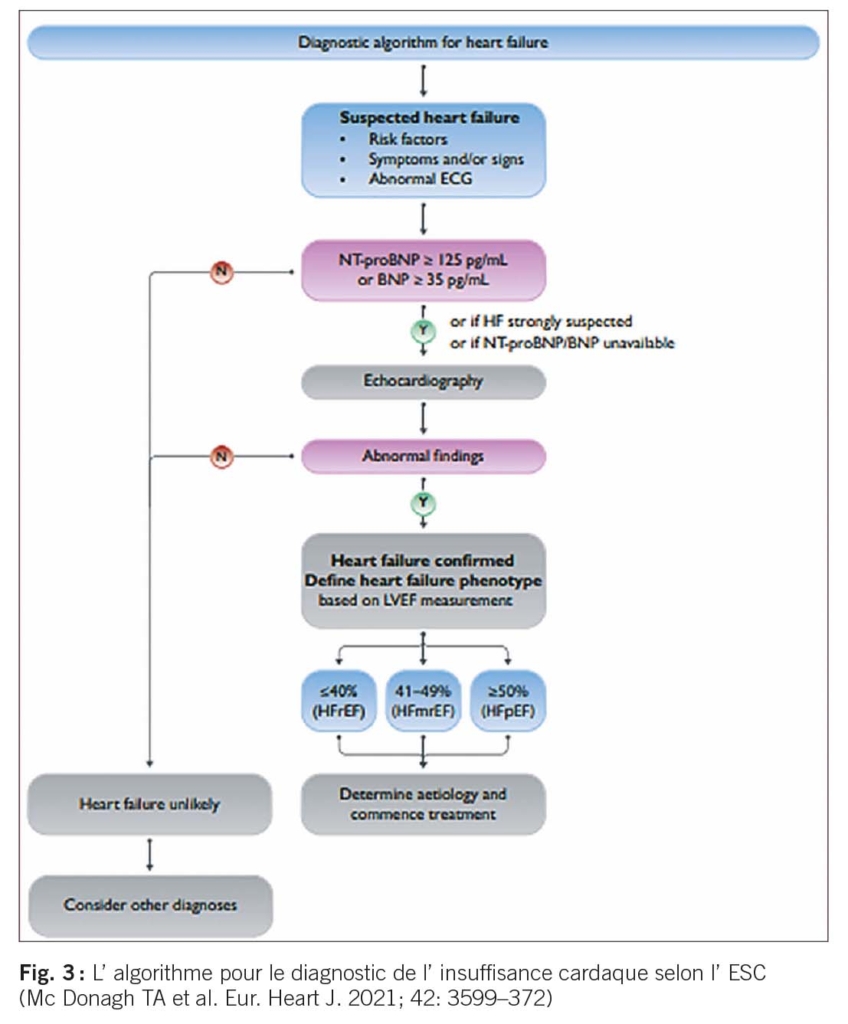 L’ algorithme pour le diagnostic de l’ insuffisance cardaque selon l’ ESC (Mc Donagh TA et al. Eur. Heart J. 2021; 42: 3599–372)