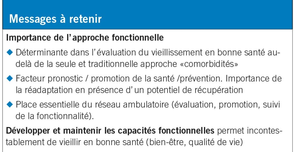 Handgrip, TUG altéré, vitesse de marche ralentie, scores bas SPPB et 6MWT : Association avec la mortalité des patients. Performance au SPPB et vitesse de marche abaissée : Association avec le déclin cognitif. Atteinte fonctionnelle (et cognitive) : Prédicteur d’ assistance dans les AVQ et risque d’ institutionnalisation.