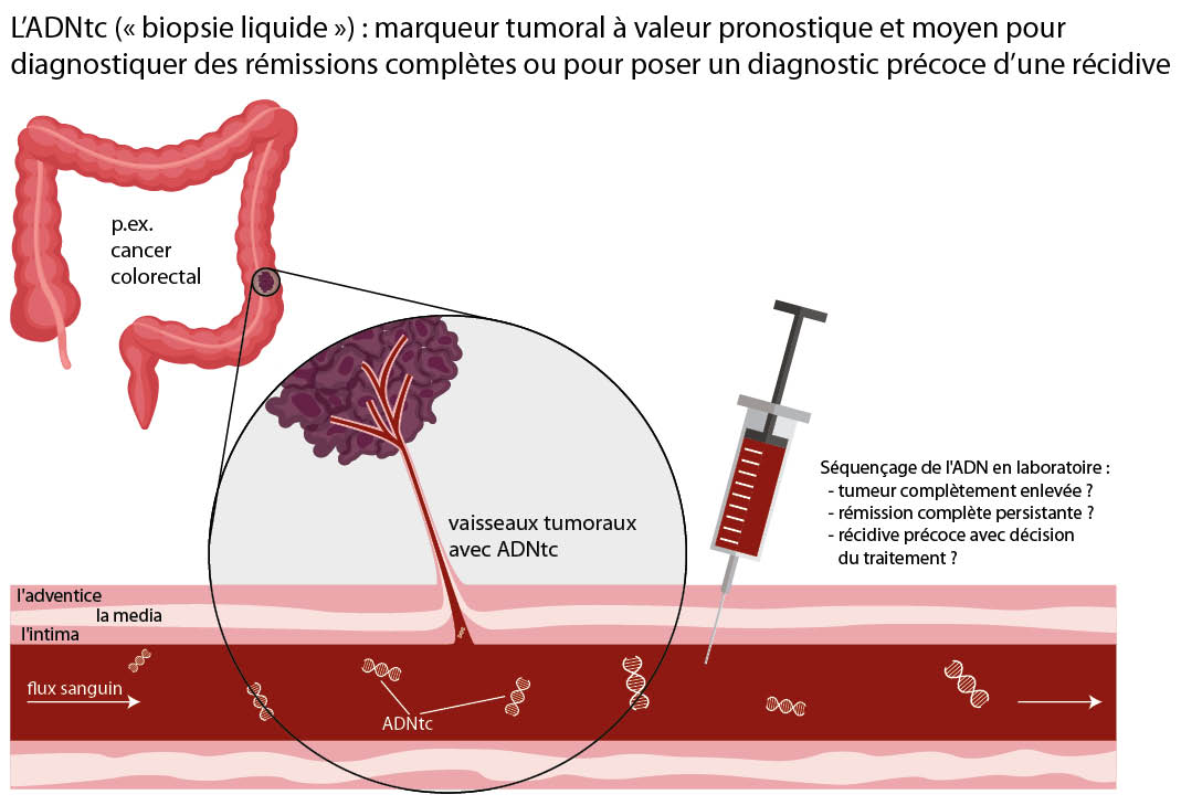 Une « biopsie liquide » (liquid biopsy) est la mise en évidence, basée sur la biologie moléculaire, d’ ADN circulant dans le sang et provenant d’ une tumeur (circulating tumor DNA – ctDNA – ADNtc, voir figure 2). Il existe également de l’ ADN circulant non tumoral, appelé ADN circulant bénin, dans toute une série de lésions organiques, par exemple l’ ADN myocardique après un infarctus du myocarde. Des méthodes de détection de plus en plus précises ainsi que de séquençage de l’ ADN extrêmement étendues et rapides (« next generation sequencing », NGS) pour détecter les mutations de l’ ADN tumoral ont ouvert à juste titre un nouveau chapitre diagnostique et thérapeutique en oncologie (1).