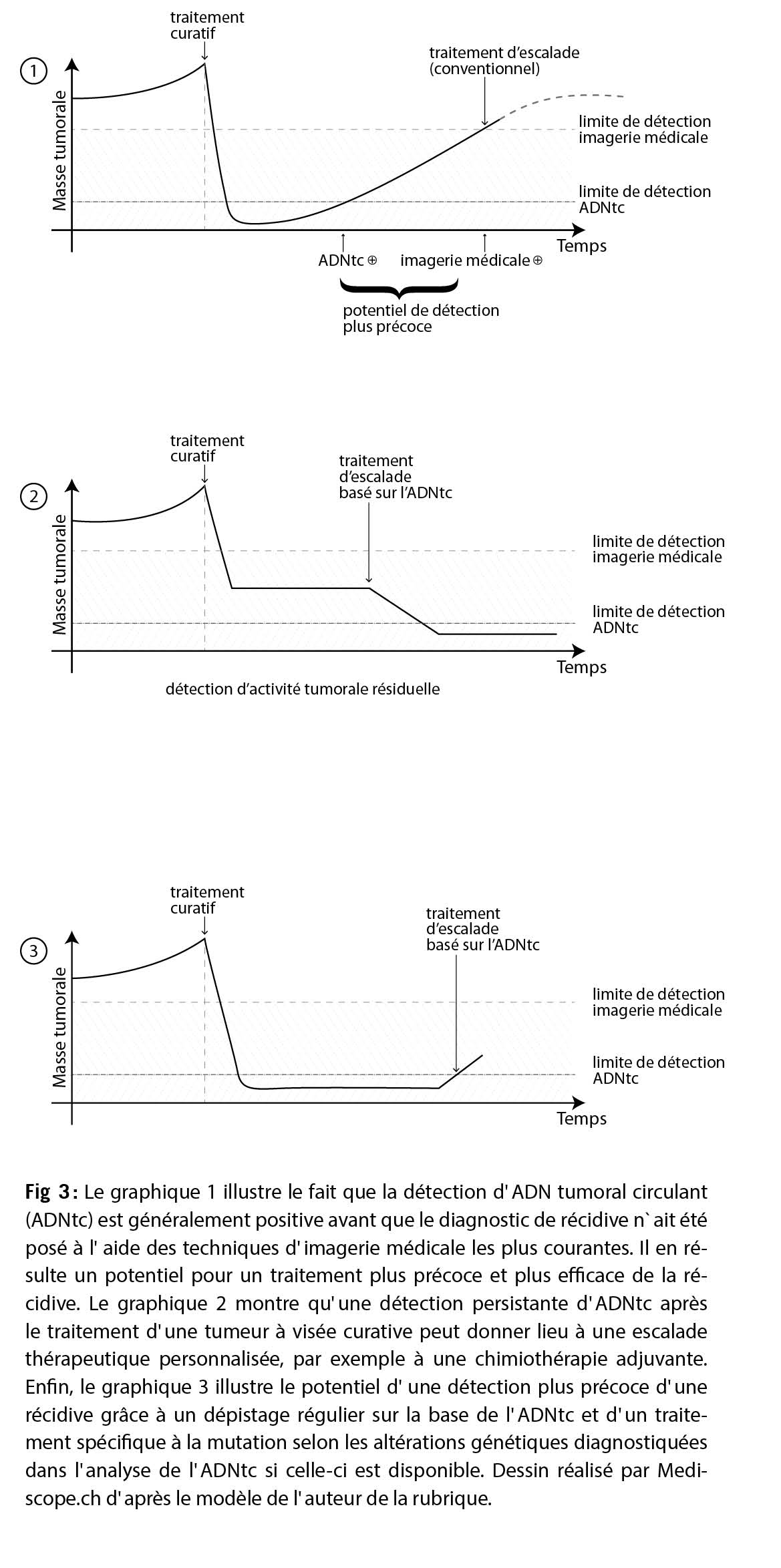 La figure 3 présente quelques possibilités de la « méthodologie ADNtc », notamment la documentation d’ une rémission complète ou seulement partielle et – on l’ espère – d’ un diagnostic plus précoce d’ une récidive avec par conséquent un meilleur pronostic. Pour certains stades du cancer colorectal, il a été démontré que les patients sans détection postopératoire d’ ADNtc pouvaient être épargnés de la chimiothérapie adjuvante. Ils n’ avaient pas de désavantage par rapport au pronostic, en comparaison avec le groupe de contrôle dans lequel de l’ ADNtc avait été détecté, ce qui nécessitait une chimiothérapie adjuvante (3). La détection d’ ADNtc doit également être envisagée en cas de biopsie tissulaire tumorale difficile ou dangereuse et peut présenter d’ autres avantages diagnostiques par rapport à celle-ci : Il y a moins de problèmes avec les « sampling errors », c’ est-à-dire lorsque la biopsie n’ est pas représentative de l’ ensemble de la tumeur. Bien que les progrès technologiques mentionnés aient réduit la probabilité de faux négatifs, il en existe toujours et le taux de faux négatifs doit être évalué pour chaque méthode et chaque type de tumeur. Outre l’ ADNtc, l’ ARN circulant provenant de la tumeur, les cellules tumorales circulantes elles-mêmes et les membranes de cellules tumorales circulantes (vésicules extracellulaires) sont également en cours d’ évaluation clinique en tant que biomarqueurs.