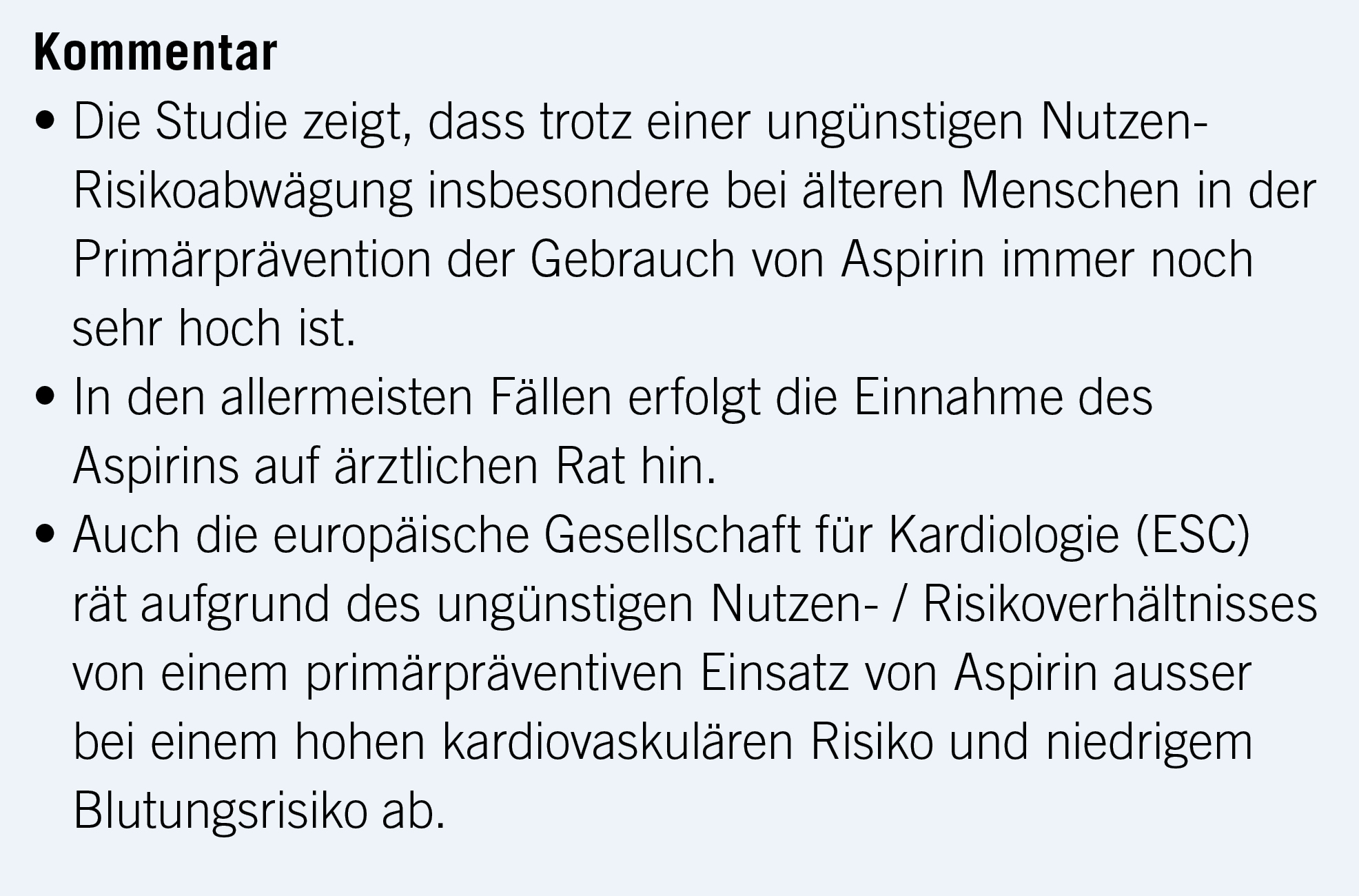Aspirin wurde lange Zeit zur Primärprophylaxe kardiovaskulärer Erkrankungen empfohlen. Jüngere Daten aus RCTs zeigten allerdings keinen überzeugenden Benefit, insbesondere angesichts des weit bedeutsameren Einflusses eines guten Lipid- und Blutdruckmanagements und dies insbesondere bei älteren Patienten. Das American College of Cardiology und die American Heart Association raten daher von der Primärprävention mit Aspirin bei Patienten über 70 ab. Die US Preventive Services Task Force rät bereits bei Über-60-Jährigen vom primärpräventiven Einsatz von Aspirin ab.