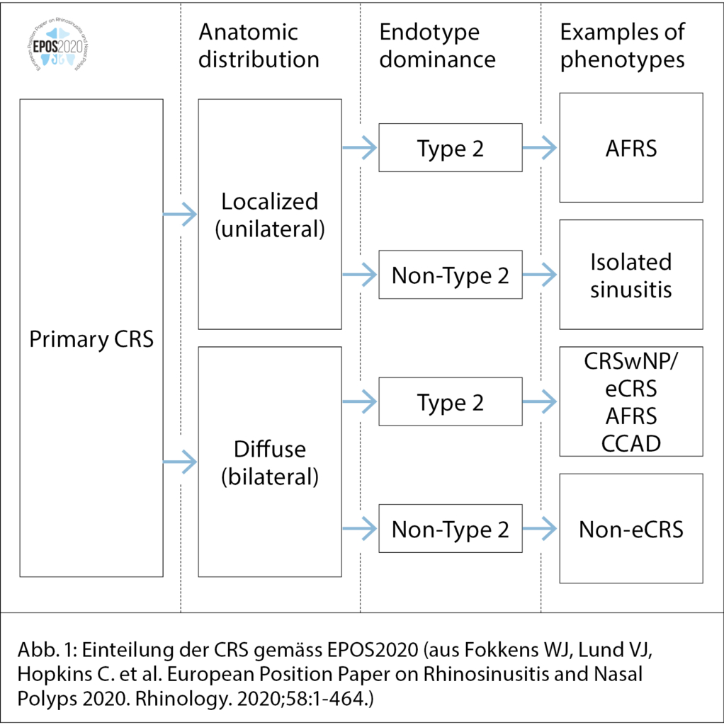 Ziel dieses Reviews ist, Grundversorger über die aktuell gültigen Guidelines zur chronischen Rhinosinusitis (CRS) zu informieren. Der hier vorgelegte Überblick basiert auf dem European Position Paper on Rhinosinusitis and Polyps, abgekürzt EPOS2020 und beschreibt die Anwendung von Biologika bei chronischer Rhinosinusitis in der Schweiz. Die Krankheit betrifft 5–12 % der Gesamtbevölkerung und tritt meist in der fünften Lebensdekade auf. Während bisher anhand des Phänotyps differenziert wurde zwischen einer CRS mit oder ohne Nasenpolypen, steht heute der diagnostisch und therapeutisch wichtige Endotyp im Vordergrund. Es werden drei Endotypen von molekularen Entzündungsmustern unterschieden. Endotyp 1 ist eine durch Interferon Gamma (IFN-γ) geprägte Entzündungsreaktion gegen intrazelluläre Pathogene, etwa Viren. Endotyp 2 ist dagegen ursprünglich gegen Parasiten gerichtet und durch IL-4, IL-5 und IL-13 vermittelt.Dies ist der vorherrschende Endotyp bei CRS und Polypen in westlichen Populationen. Endotyp 3 wehrt unter Sekretion von IL-17 und IL-22 extrazelluläre Bakterien ab. Eine traditionelle Unterteilung der CRS in eine Form mit und ohne Polypen (CRSwNP/CRSsNP) wird in der neueren Literatur zunehmend verlassen zugunsten der Endotypen. Für den klinischen Alltag hat sich eine vereinfachende Unterteilung in Typ-2- und Non-Typ-2-Entzündung durchgesetzt. Aus den Endotypen werden die Phänotypen hergeleitet, ein Endotyp kann zu verschiedenen Phänotypen führen (1).