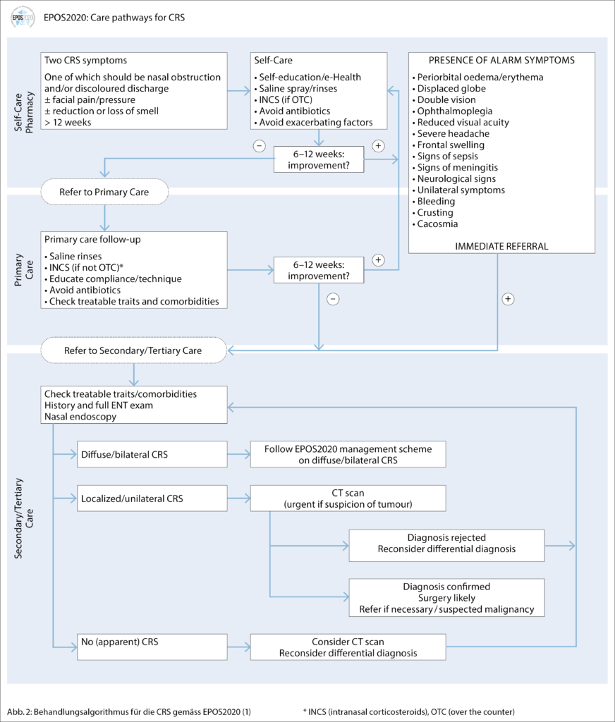 Bei Beschwerdepersistenz sollte eine Überweisung für eine rhinologische Abklärung bei einem HNO-Arzt erfolgen (Abb. 2). Differenzialdiagnostisch ist auch an eine sekundäre CRS zu denken, wobei hier bei Kindern vor allem eine primär ziliäre Dyskinesie oder zystische Fibrose und bei Erwachsenen eine Vaskulitis wie eine Granulomatose mit Polyangiitis infrage kommen.
