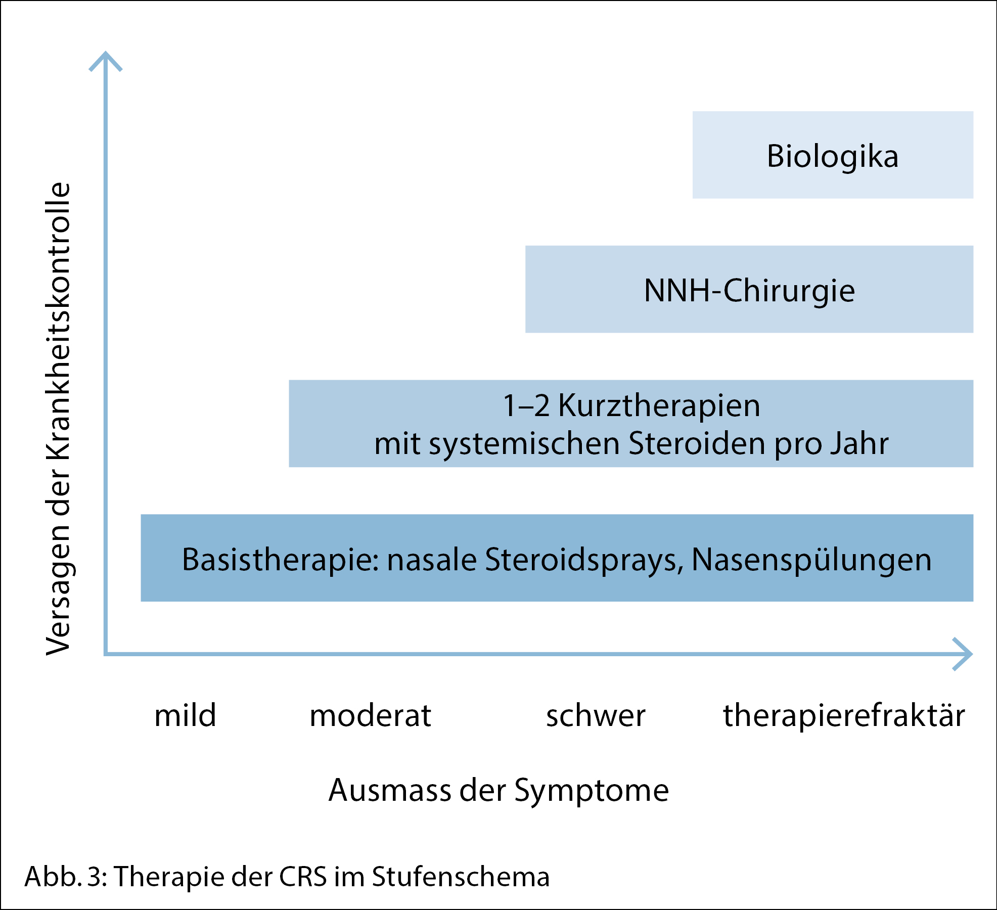 • Die CRS kann in den meisten Fällen symptombezogen und stufengerecht mit einer Basistherapie bestehend aus Salzwassernasenspülungen und topischen Steroidsprays, maximal 1–2 kurzdauernden oralen Steroidbehandlungen oder einer NNH-Operation erfolgreich behandelt werden.