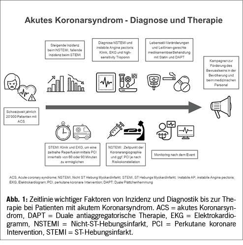 In der Schweiz sind jährlich rund 20 000 Personen von einem akuten Koronarsyndrom betroffen. Ein akutes Koronarsyndrom umfasst den ST-Hebungsinfarkt (STEMI), den Nicht-ST-Hebungsinfarkt (NSTEMI) und die instabile Angina pectoris. Die Diagnostik basiert auf der klinischen Präsentation, auf kardialen Biomarkern und dem EKG. Bei Patienten mit akutem STEMI gilt die Prämisse ‚Zeit ist Herzmuskel‘ und es gilt, die verschlossene Koronararterie so schnell wie möglich mittels perkutaner koronarer Intervention (PCI) wieder zu eröffnen. Bei Patienten mit NSTEMI oder instabiler Angina pectoris wird der Zeitpunkt der Koronarangiographie und ggf PCI nach vorgängiger Risikostratifikation festgelegt. Eine optimale Sekundärprävention und strikte Kontrolle der kardiovaskulären Risikofaktoren sind bei allen Patienten mit akutem Koronarsyndrom essenziell.