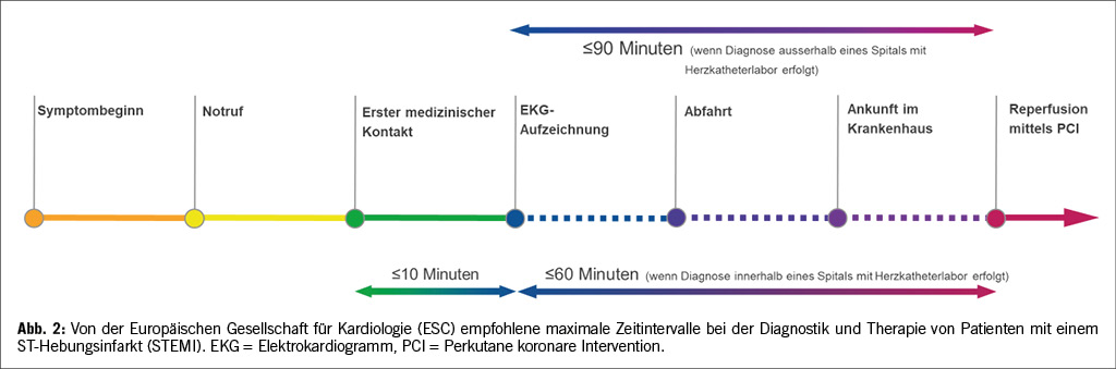 In den ESC Guidelines für die Behandlung von Patienten mit ACS wird die Wichtigkeit einer zeitnahen Revaskularisation betont (5). Sofern das Zeitintervall von der STEMI-Diagnose bis zur Revaskularisation unter 120 Minuten liegt, sollte eine perkutane koronare Intervention (PCI) angestrebt werden, was in der Schweiz aufgrund der nahen Distanzen gut möglich ist. Kann kein Herzkatheterlabor zeitnah erreicht werden, bleibt die Fibrinolyse die Therapie der Wahl. Abbildung 1 gibt eine Übersicht über die Zeitintervalle, welche bei Patienten mit STEMI eingehalten werden sollten. Nach Diagnose eines STEMIs sollte die Zeit bis zur Reperfusion mittels PCI maximal 90 Minuten dauern, wenn die initiale Diagnose in einem Spital ohne Herzkatheterlabor gestellt wird (5, 10). Wird die Diagnose eines STEMIs in einem Spital mit Herzkatheterlabor gestellt, sollten nicht mehr als 60 Minuten bis zur Revaskularisation des Infarktgefässes vergehen (5).