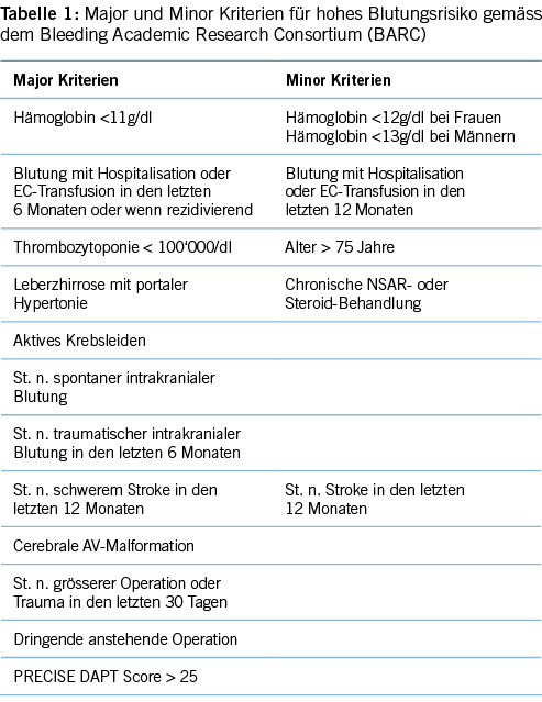 Bei Patienten mit ACS ist die Gabe eines P2Y12-Inhibitors indiziert mit entsprechender Ladedosis, wobei bei Patienten mit Myokardinfarkt Prasugrel und Ticagrelor in randomisierten Studien dem Clopidogrel überlegen waren und deshalb prioritär eingesetzt werden (5, 29, 30). Eine duale Thrombozytenaggregationshemmung (DAPT) ist grundsätzlich für ein Jahr nach ACS indiziert, kann aber je nach Blutungs- oder Ischämie-Risiko individuell verkürzt oder verlängert werden (Tabelle 1) (5, 31, 32). Eine gleichzeitige Therapie mittels Protononenpumper-Inhibitor wird für die Dauer der DAPT bei Patienten mit erhöhtem Risiko einer gastrointestinalen Blutung empfohlen (5).