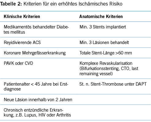 Patienten mit hohem ischämischem Risiko können von einer prolongierten Antikoagulation/Antiaggregation nach einer 12-monatigen DAPT profitieren, vorausgesetzt, es sind zwischenzeitlich keine Blutungsereignisse aufgetreten (Tabelle 2) (5). Somit sollte erst 1 Jahr nach ACS über eine mögliche Verlängerung der Antikoagulation/Antiaggregation entschieden werden. Verschiedene Therapie-Schemata wurden in randomisierten Studien untersucht. Die Prevention of Cardiovascular Events in Patients with Prior Heart Attack Using Ticagrelor Compared to Placebo on a Background of Aspirin–Thrombolysis in Myocardial Infarction (PEGASUS-TIMI) 54 Studie konnte zeigen, dass eine verlängerte Therapie mit Ticagrelor (in reduzierter Dosis von zweimal 60 mg täglich) die Rate an ischämischen Ereignissen signifikant reduziert, dies bei erhöhten Blutungsraten (32). In die Studie wurden Patienten mit stattgehabtem Myokardinfarkt (vor 1-3 Jahren) und mindestens einem weiteren Risikofaktor (Alter >65 Jahre, Diabetes mellitus, stattgehabte Myokardinfarkte, koronare Mehrgefässerkrankung oder chronische Niereninsuffizienz) eingeschlossen (32). Alternativ kann nach 12-monatiger DAPT – der (Cardiovascular Outcomes for People Using Anticoagulation Strategies) COMPASS Studie folgend – ein Wechsel auf Aspirin in Kombination mit Rivaroxaban in niedriger Dosierung (zweimal 2.5 mg täglich) erfolgen (34). In die COMPASS Studie wurden Patienten mit stabiler koronarer Herzkrankheit oder peripher arterieller Verschlusskrankheit eingeschlossen, bei Patienten unter 65-jährig wurde zusätzlich eine atherosklerotische Erkrankung in mindestens zwei Gefässbetten oder das Vorliegen von mindestens 2 weiteren Risikofaktoren (Rauchen, Diabetes mellitus, eine eingeschränkte Nierenfunktion, eine Herzinsuffizienz oder ein Schlaganfall) verlangt (34). Die Studie zeigte eine verminderte Rate ischämischer Ereignisse unter der Kombinationstherapie Aspirin und niedrigdosiertem Rivaroxaban bei auch hier erhöhtem Risiko von Blutungsereignissen (34).