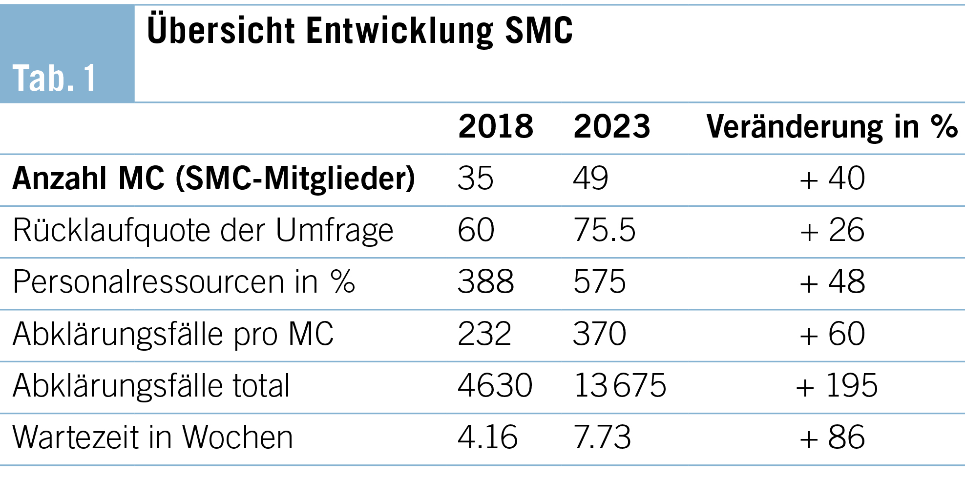 Die folgende Tab. 1 orientiert über die Entwicklung innerhalb des SMC-Netzwerks von 2018 bis 2023. Es lässt sich eine klare Zunahme der Anzahl an MC sowie der Personalressourcen pro MC festhalten bei allerdings gleichzeitig ansteigenden Wartezeiten.