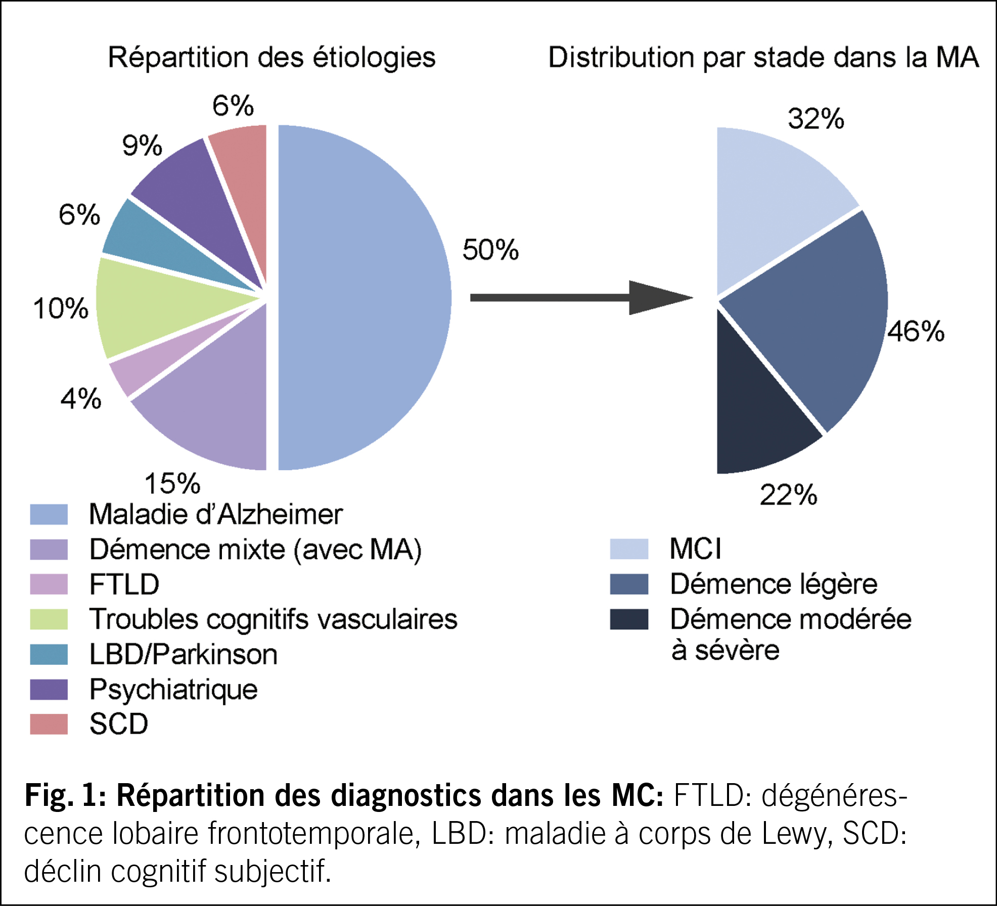 La répartition des diagnostics en 2023 est présentée dans la fig. 1. Les données sont basées sur des estimations. Une MA représente 65 % des cas. Dans 39 % la MA est un stade de MCI ou de démence légère.