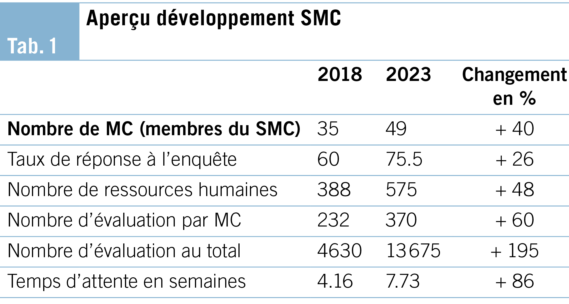 Le tab. 1 ci-dessous présente l’ évolution au sein du réseau SMC entre 2018 et 2023. On constate une nette augmentation du nombre de MC et des ressources en personnel par MC accompagnée d’ une augmentation des délais d’ attente.