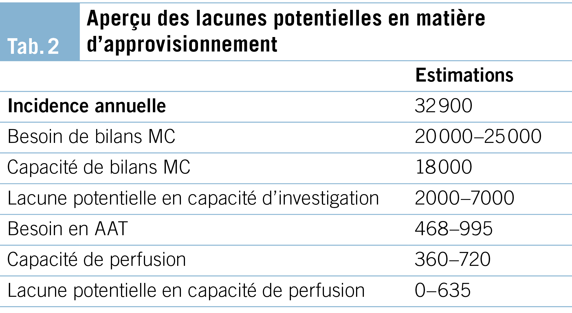 L’ augmentation anticipée des besoins en ressources pour les examens spécialisés en cas d’ autorisation de nouvelles AAT contraste avec les pénuries de ressources dans le domaine du personnel spécialisé, avec une tendance à l’ augmentation des temps d’ attente et une capacité d’ extension limitée à environ 18 000 de bilans par an. Les estimations des lacunes potentielles en matière de capacités pour les thérapies par perfusion sont incertaines et vont de 0 à 635. Nous ne prévoyons toutefois pas de lacunes importantes à long terme. L’ accès aux diagnostics complémentaires par appareillage ou par chimie de laboratoire semble poser peu de problèmes à la Suisse. Les mesures qui peuvent contribuer à compenser le manque de ressources comprennent l’ intensification des coopérations à l’ intérieur et à l’ extérieur des institutions respectives ainsi que les développements diagnostiques et thérapeutiques (voir ci-dessous, Tab. 2).